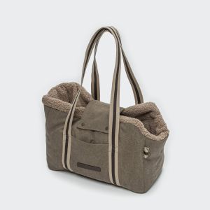 Мінімалістична сумка-переноска для собак із м’яким «тедді» підкладом у кольорі canvas sand — це зручне мобільне місце для сну та відпочинку вашого улюбленця під час подорожей.