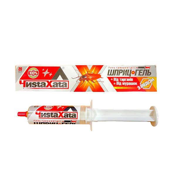 Універсальний інсектицидний гель Чистий Будинок застосовується для знищення тарганів, побутових та садових мурах на різних житлових та нежитлових ділянках та приміщеннях.Препарат активно приваблює комах завдяки атрактанту у складі.Діюча речовина інсектицидного гелю борна кислота.Наявність даної речовини в організмі у певній дозі сприяє зневодненню комахи, а також руйнує шлунково-кишковий тракт, внаслідок чого шкідники гинуть.Знищення тарганів відбувається на 1-3 дні.Мурахи гинуть у першу добу після контакту з речовиною.Після нанесення засіб зберігає свою активність протягом місяця.Ця речовина не викликає резистентності у комах, тому препарат Чиста хата є ефективним засобом від тарганів та мурах, що забезпечує якісний захист від цих комах.Переваги гелю від тарганів Чиста хата:Чиста Хата має тривалий період захисної дії до 1 місяця.Продукт максимально простий та зручний у використанні.Препарат контролює широкий спектр комах.Гель активно приваблює комах завдяки харчовому атрактанту з медовим смаком.Інсектицидний гель Чиста хата не викликає резистентності у комах