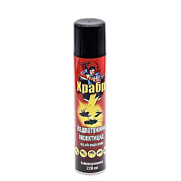 Призначений для всіх видів комах, що літають і нелітають - мух, тарганів, комарів, москітів, мурах, бліх, клопів, метеликів, молі, павуків та інших видів комах.Запатентована формула та найвища сертифікована Європейська якість роблять цей надпотужний інсектицидний засіб ультаефективним і не має аналогів на ринку України.Засіб є абсолютно нешкідливим для людини та домашніх тварин, і відповідає всім стандартам безпеки Європейського Союзу.Як застосовувати дихлофос інсектицид ХрабрЩоб знищити комах, що літають, струмінь аерозолю Хоробр направити в повітря або в місця скупчення комах.Щоб знищити комах, що повзають, струмінь аерозолю Хоробр направити безпосередньо на скупчення комах або в місця їх проживання.При обробці балон тримати в 20 см від місця, що обробляється, а через 15 хвилин після обробки ретельно провітрити приміщення протягом не менше 30 хв.Запобіжні заходи при користуванні інсектицидом Хоробр:Зберігати при температурі від -20C до +40C окремо від харчових продуктів у місцях, недоступних для дітей.Після застосування порожній балон утилізуватиме як побутовий відхід.Призначений для всіх видів комах, що літають і нелітають - мух, тарганів, комарів, москітів, мурах, бліх, клопів, метеликів, молі, павуків та інших видів комах.Запатентована формула та найвища сертифікована Європейська якість роблять цей надпотужний інсектицидний засіб ультаефективним і не має аналогів на ринку України.Засіб є абсолютно нешкідливим для людини та домашніх тварин, і відповідає всім стандартам безпеки Європейського Союзу.
