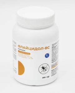 Однорідна сипуча суміш гранул або порошку від білого до яскраво-жовтого кольору, без механічних домішок.СКЛАД1 г препарату містить:циперметрин 20 мгпіперонілбутоксид 26 мгD-транс тетраметрин 4 мг.Допоміжні речовини: трикозен, тенсопол, гідролізовані білки, лактоза, цукор.Фармакологічні властивості.Флайцидол-ВС має широкий спектр інсектицидної дії, забезпечуючи знищення комах відразу після нанесення препарату.Циперметрин відноситься до групи синтетичних піретроїдів, механізм дії яких полягає у порушенні проникності клітинних мембран, блокуванні передачі нервових імпульсів, що викликає порушення координації руху, параліч і швидку загибель комах.Піперонілбутоксид підсилює ефективність піретроїдів, інактивуючи ферменти, що руйнують їх у комах.D-транс тетраметрин впливає на нервову систему: порушує обмін іонів калію та натрію у пресинаптичній мембрані, що спричиняє надлишкове виділення ацетилхоліну, збудження та параліч комах.Тривалість дії:на відкритих обєктах 46 тижнівна поверхнях у приміщеннях 68 тижнів.За токсичністю:при пероральному застосуванні 3 клас (помірно небезпечні),при нанесенні на шкіру 4 клас (малонебезпечні).Робочий розчин не має сенсибілізуючої та шкірно-резорбтивної дії.Застосування.Препарат використовують для знищення мух, а також для боротьби з тарганами та блохами.Методи нанесення: генератор холодного туману, аерозольний розпилювач, пензель.Приготування розчину:Аерозоль: 250 г порошку + 2000 мл води 100 мПензель: 250 г порошку + 200 мл води 200 мРозчин готують безпосередньо перед використанням, перемішуючи 5 хв.Попередження:Використовувати у день приготування.Не наносити на забруднені, пористі або свіжозабарвлені поверхні.Не обробляти поверхні, що контактують з їжею чи кормами.Тварин виводять із приміщення до висихання.Токсично для бджілПротипоказання:Не комбінувати з іншими інсектицидами.Заборонено обробляти поблизу водойм та місць гніздування птахів.Випас худоби, збирання грибів та ягід дозволяється через 40 днів після обробки.Форма випуску:Пластикові контейнери по 255000 г, пакети по 10125 г.Зберігання:У сухому темному вентильованому місці при 1030 C.Термін придатності 5 років.Для ветеринарного застосування