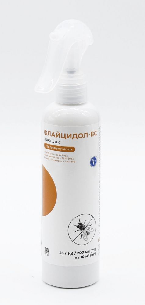 Фармакологічні властивостіАТС-vet код: QP53 Ектопаразитициди, інсектициди та репеленти.Флайцидол-ВС має широкий спектр інсектицидної дії, забезпечуючи знищення комах відразу після нанесення препарату.Циперметрин синтетичний піретроїд, порушує проникність клітинних мембран, блокує передачу нервових імпульсів, що викликає порушення координації руху, параліч і загибель комах.Піперонілбутоксид не інсектицид, але підвищує ефективність піретроїдів, інактивуючи ферменти комах, що руйнують піретроїди.D-транс тетраметрин впливає на нервову систему комах, викликає надлишкове виділення ацетилхоліну і параліч.Тривалість дії:На відкритих обєктах 46 тижнівНа поверхнях у приміщеннях 68 тижнівКлас небезпеки:Перорально 3 клас помірно небезпечнихПри нанесенні на шкіру 4 клас малонебезпечнихРобочий розчин не має сенсибілізуючої та шкірно-резорбтивної дії.ЗастосуванняПрепарат застосовують для знищення мух, тарганів і бліх у тваринницьких приміщеннях та інших обєктах.Для нанесення використовують генератор холодного туману, побутовий аерозольний розпилювач або кисть.Робочий розчин готують перед застосуванням.Дозування:СпосібПорошокВодаПлоща обробкиАерозоль250 г2000 мл100 мПензель250 г200 мл200 мФлайцидол-ВС змішують з водою, рівномірно перемішують 5 хвилин.Наносять у місцях, де найбільше перебувають комахи (стіни, верстати, віконні рами, двері, труби, молокопроводи тощо).Ефективність: 90 для ендофільних видів, 70 для екзофільних видів.ПопередженняРозчин ретельно перемішати якщо обробка перервана 30 хв повторно перемішати.Використовувати розчин того ж дня.Не наносити на сильно забруднені, пористі або свіжозабарвлені поверхні.Не обробляти поверхні для продуктів харчування чи годівниць.Вивести тварин із приміщення під час обробки.Додаткові обробки личинок у весняно-літній період для запобігання новій генерації комах.Для підвищення ефективності використовувати воду без хлору та пероксидів.Токсичний для бджілПриготування та нанесення робочого розчину у захисному одязі, рукавичках та окулярах. Не вживати їжу, не палити, уникати потрапляння на шкіру та очі, не вдихати препарат.ПротипоказанняНе використовувати з іншими інсектицидами.Не обробляти території ближче 500 м до водних обєктів, санітарних зон і джерел водопостачання.На природних територіях випас худоби, збір ягід і грибів лише через 40 днів після обробки.Не обробляти місця гніздування та скупчення диких птахів.ЗберіганняЗберігати в упаковці виробника у сухому темному місці, температура 1030 C.Термін придатності 5 років.