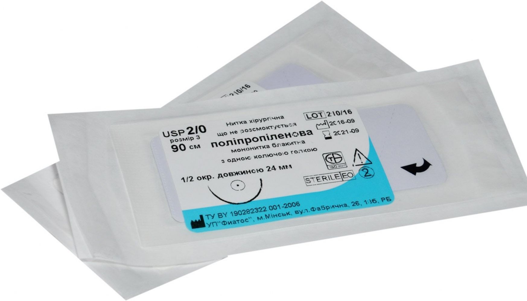 Поліпропілен-шовний матеріал з ріжучою голкою 38 кола - USP 40 (EP 1,5) 19мм ПДССинтетична розсмоктується мононить складається з 100 полідіоксанона.Полімер полідіоксанон не має антигенних властивостей і викликає незначну реакцію тканин при розсмоктуванні.Терміни розсмоктуванняВтрата 50 міцності через 30 діб повне розсмоктування 180-210 діб.При комбінації нитки з голкою, голки мають різну довжину, діаметр, ступінь зігнутості, форму поперечного перерізу і тип вістря голки.У кожному конкретному випадку вибір шовного матеріалу визначається хірургом при наявності показань в залежності від виду операції і розміру рани відповідно до хірургічними методиками.Застосовується для накладення швів на всі види мяких тканин в пластичній хірургії, педіатрії, урології, гінекології, загальної хірургії, стоматології в ситуаціях, коли потрібна більш тривала підтримка країв рани (до шести тижнів).Гладка поверхня мононитки ПДС забезпечує її легке проходження через тканини без їх травматизації.Шовний матеріал ПДС відповідає європейським сертифікатам ISO 9001 та ISO 13485.Є аналогомПДС-II, ПДО, Моносорб, ДАР-ВИН моно, Сургікрол, MonoPlus