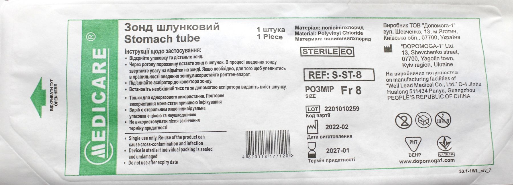 Призначення: для шлункового зондування з лікувальною або діагностичною метою.Розміри:загальна довжина зонда 1245 мм,корисна довжина зонда 1215 мм.Тривалість використання: до 7 днів.Характеристики:зонд виготовлений із полівінілхлоридутермопластичний матеріал помякшується за температури тілагладка поверхня та атравматичний дистальний кінець закругленої форми забезпечують легкість та нетравматичність введення зонданаявність міток глибини введення від дистального кінцяна закритому кінці зонда є 4 бічні отворирентгенконтрастна лінія по всій довжині для апаратного контролю за розташуванням зонда колірне кодування конектора для швидкого визначення розмірустерильний, апірогенний, нетоксичнийдля одноразового використанняіндивідуальне упакування.