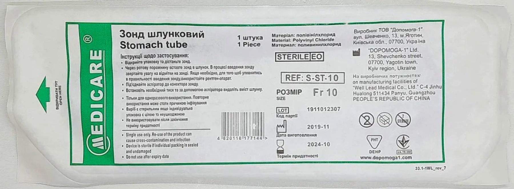 Призначення: для шлункового зондування з лікувальною або діагностичною метою.Розміри:загальна довжина зонда 1245 мм,корисна довжина зонда 1215 мм.Тривалість використання: до 7 днів.Характеристики:зонд виготовлений із полівінілхлоридутермопластичний матеріал помякшується за температури тілагладка поверхня та атравматичний дистальний кінець закругленої форми забезпечують легкість та нетравматичність введення зонданаявність міток глибини введення від дистального кінцяна закритому кінці зонда є 4 бічні отворирентгенконтрастна лінія по всій довжині для апаратного контролю за розташуванням зонда колірне кодування конектора для швидкого визначення розмірустерильний, апірогенний, нетоксичнийдля одноразового використанняіндивідуальне упакування.