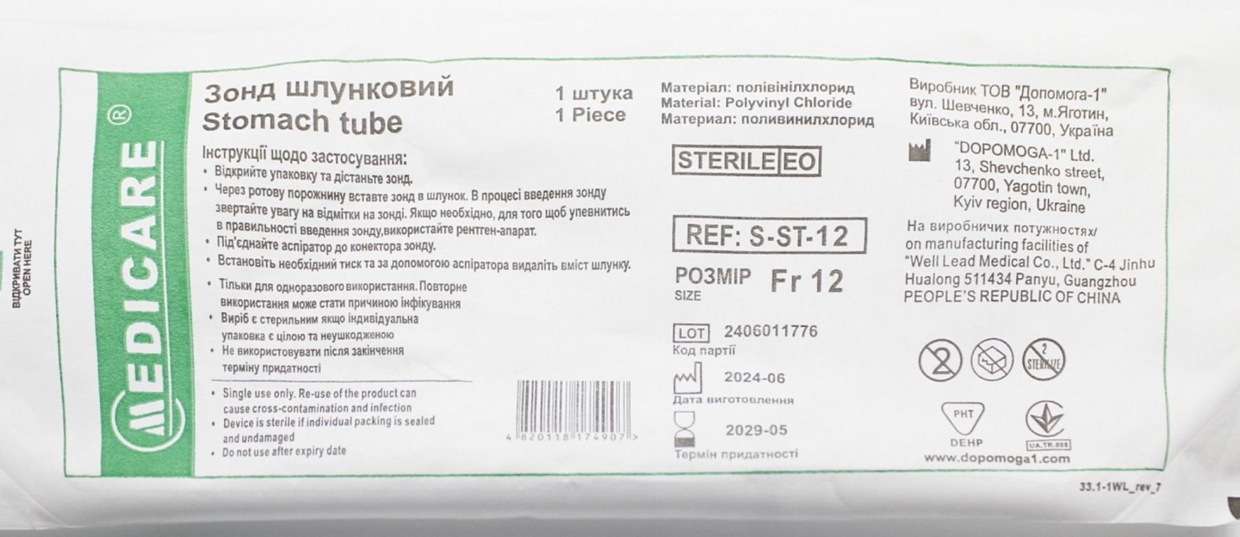 Призначення: для шлункового зондування з лікувальною або діагностичною метою.Розміри:загальна довжина зонда 1245 мм,корисна довжина зонда 1215 мм.Тривалість використання: до 7 днів.Характеристики:зонд виготовлений із полівінілхлоридутермопластичний матеріал помякшується за температури тілагладка поверхня та атравматичний дистальний кінець закругленої форми забезпечують легкість та нетравматичність введення зонданаявність міток глибини введення від дистального кінцяна закритому кінці зонда є 4 бічні отворирентгенконтрастна лінія по всій довжині для апаратного контролю за розташуванням зонда колірне кодування конектора для швидкого визначення розмірустерильний, апірогенний, нетоксичнийдля одноразового використанняіндивідуальне упакування.
