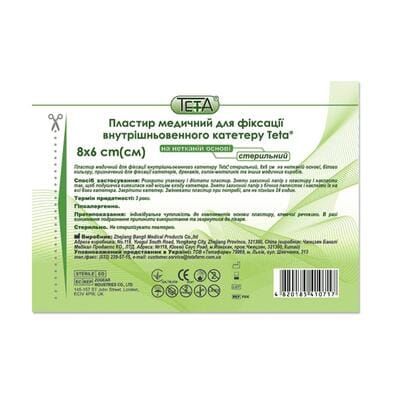 Опис Пластир медичний Teta на нетканій основі, для фіксації внутрішньовенного катетера, 6 х 8 см, 1 штукаОписПластир медичний для фіксації внутрішньовенного катетера Тета призначений для фіксації катетерів, дренажів, голок-метеликів та інших медичних пристроїв. Еластична перфорована основа та U-подібний виріз забезпечує надійну фіксацію повязки навколо катетера.Пластир гіпоалергенний, підходить для застосування у пацієнтів з нормальною та високою чутливістю шкіри. Завдяки гіпоалергенному клейовому шару пластир не викликає алергічних реакцій та подразнень, надійно фіксується на поверхні тіла та легко розподіляється у місці накладання, ізолюючи місце інєкції від потрапляння інфекції.Клеюча основа, захищена спеціальним вощеним папером з поздовжнім розрізом, який легко видаляється. Перфорована структура основи характеризується високою повітро- та паропроникністю, дозволяючи шкірі під пластиром дихати, не викликаючи мацерації.