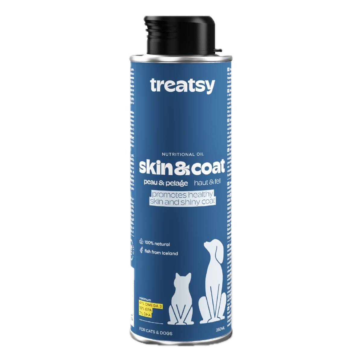 Олія Treatsy Skin & Coat – це унікальна формула, розроблена для покращення стану шкіри та шерсті ваших улюбленців. Вона містить високу концентрацію Омега-3 жирних кислот, EPA та DHA, які допомагають боротися з запаленнями та підтримувати здоров'я шкіри.