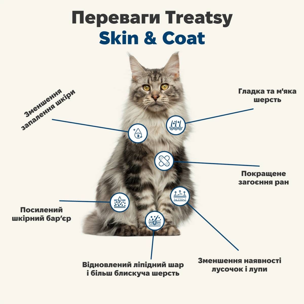 Treatsy Skin & Coat – це ефективний спосіб покращити зовнішній вигляд та здоров'я шкіри та шерсті вашого улюбленця. Використовуйте її в поєднанні з іншими продуктами Treatsy для максимального результату.