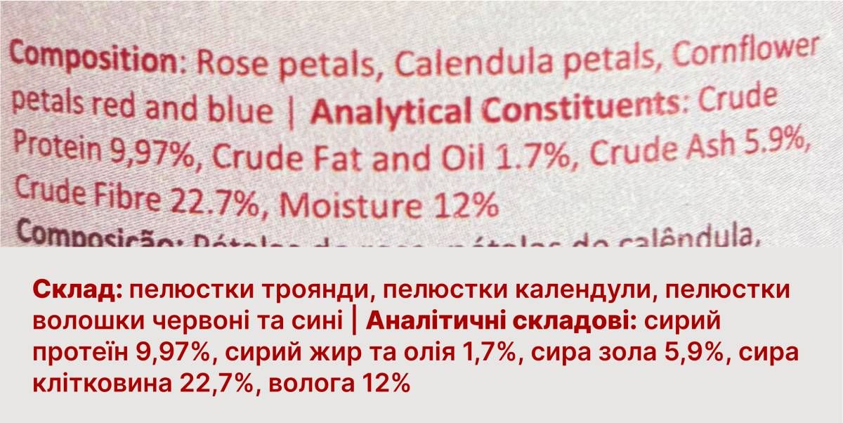 До складу входять календула, роза, волошка та інші корисні квіти, які мають заспокійливі, антиоксидантні та протизапальні властивості.