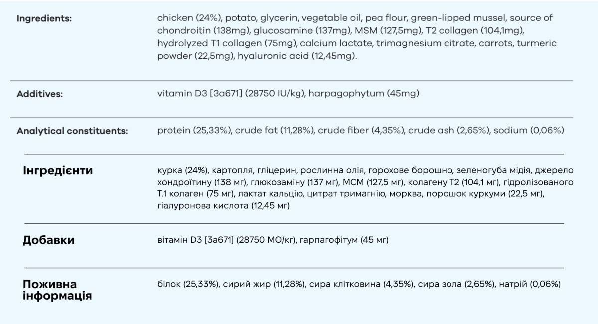 - Підтримка здоров'я суглобів: Допомагає покращити рухливість та зменшити біль в суглобах.