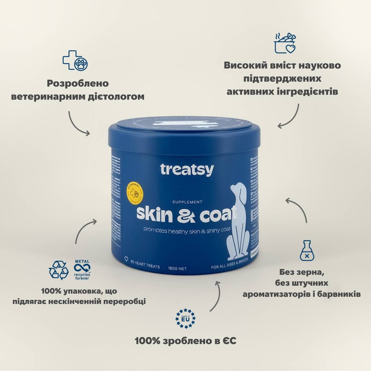 Treatsy Skin & Coat – це унікальна формула, розроблена для покращення стану шкіри та шерсті собак. Вона містить високу концентрацію науково доведених активних інгредієнтів, які допомагають підтримувати здоров'я шкіри, зменшити свербіж, лущення та сприяти загоєнню ран.