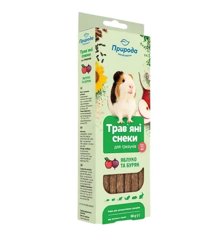 Особливості:збагачують раціон ваших улюбленців корисними речовинами та рослинними волокнами, які необхідні для постійного сточування зубівласощі виготовлені виключно з натуральних компонентівне містять цукор, штучні барвники та ароматизаторияблуко та буряк доповнює меню вітамінами та мікроелементами, які зміцнюють імунітет та нормалізують обмін речовинневеликі за розміром ласощі зручні для улюбленців, їм можна годувати пухнастих друзів з руки.Рекомендації:додавати до щоденного раціонуу напувалці завжди має бути свіжа вода.Склад товару:травяна січка, вівсяні пластівці, кероб подрібнений, крупа горохова, насіння соняшника, яблука сушені, буряк сушений