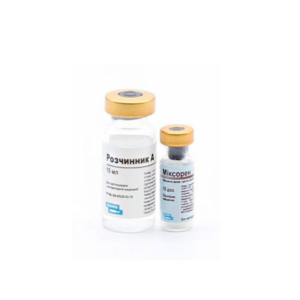 Опис вакцини МиксоренМіксоматоз це вірусне захворювання кроликів, небезпечне своєю контагіозністю і високою смертністю. Зараження відбувається контактно або через укуси комах. Лікування тварин малоефективно. Своєчасна профілактична вакцинація дозволяє вберегти поголівя від даного захворювання. Для цього успішно використовується вакцина Миксорен (Myxsoren) компанії Біовета (Чехія). Інструкція по застосуваннюМиксорен являє собою живу вакцину з ослабленим вірусом Myxomatosis cuniculorum. Інструкція передбачає три методу вакцинації: безигольний з допомогою аплікатора, підшкірний і у вушну раковину кролика за допомогою спеціальної подвійної голки. Препарат випускається у флаконах зі скла, де окремо знаходиться лиофилизированное речовина з збудником і розчинник. Ліофілізат містить 1, 10 і 20 доз у кожному флаконі для підшкірного введення. У разі щеплення без голки 10 доз розподіляється на 40 тварин, а методом подвійного уколу можна прищепити вже 50 кроликів. У місцях, неблагополучних по даному захворюванню, кроликів проводять вакцинацію, починаючи з 4-тижневого віку, з ревакцинацією через 1,5 місяці. До цього часу кроленята захищені антитілами, отриманими від матері. В інших випадках прищеплюються тільки клінічно здорові тварини з віку 10 тижнів.У неблагополучних районах прищеплюють тварин двічі: навесні і влітку. У разі вакцинації у віці від 10 тижнів і старше з ревакцинацією через 6 тижнів імунітет до захворювання зберігається до одного року. Надалі кроликів прищеплюють через рік. Допускається одночасне введення вакцини проти вірусної геморагічної хвороби, але без їх змішування між собою. За умови дотримання температурного режиму допускається вакцину Миксорен купити і зберігати до двох років. Після розведення препарат повинен бути використаний протягом 4-х годин.
