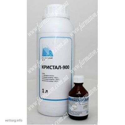Опис:Прозора, блакитна, піниста рідина.Склад:1 л препарату містить:глутаровий альдегід - 95,0 гглоксалевий альдегід - 70,0 гбензалкония хлорид - 87,5 р. Фармакологічні властивості:Препарат має бактерицидну (M. tuberculosis, Bac. anthracis, Escherichia coli, Salmonella typhymurium, Klebsiella pneumoniae, Staphylococcus aureus, Streptococcus pyogenes, St agalactiae, Bacillus subtilis, Pseudomonas aeruginosa, Proteus vulgaris та ін), фунгіцидну (Aspergilus flavus, Candida albicans), спороцидну і вирулицидное дії.Застосування:Дезінфекція тваринницьких та птахівничих приміщень, інкубаторів, систем подачі питної води, забійних і мясопереробативающих цехів, обладнання молочної промисловості, цехів з переробки птиці та яєць, ветпунктовв, амбулаторій, лабораторій, продовольчих ринків, транспортних засобів, інвентарю, тари, спецодягу та інших обєктів і обладнання, які підлягають ветеринарному нагляду. Препарат володіє полі функціональної дією, зокрема миючими та дезодоруючими властивостями.Дозування:Дезінфекцію здійснюють робочими розчинами Кристала-900 шляхом вологої обробки поверхонь (зрошення, протирання, занурення, циркуляційний промивання тощо) до повного їх зволоження, а також способом аерозольного розпилення.З продезінфікованих поверхонь, що не контактують з харчовими продуктами, залишки препарату можна не змивати водою.Для дезінфекції готують робочі розчини препарату, безпосередньо перед застосуванням (згідно таблиці), у промаркованих ємностях з будь-яких матеріалів шляхом розведення кошти водою при перемішуванні до повного розчинення.Концентрація робочого розчину (за препаратом):Кількість Кристала-900 для приготування:10 л робочого розчину, мл:100 л робочого розчину, мл:0,219,0190,00,548,0480,03,0286,02860,0 Робочі розчини Кристала-900 при зберіганні в герметичній тарі не втрачають антимікробну активність і можуть використовуватися для проведення дезінфекції протягом 14 діб з дня приготування.Дезінфекцію робочими розчинами Кристала-900 проводять після ретельного очищення поверхонь в приміщеннях, обладнання, транспортних засобів, інвентарю і т. п. згідно з Інструкцією з проведення ветеринарної дезінфекції обєктів тваринництва, затвердженої Головним управлінням ветеринарії Держагропрому СРСР від 25.08.1988 р. Профілактичну і вимушену дезінфекцію: тваринницьких і птахівничих приміщень і устаткування в них проводять:способом зрошення та протирання поверхонь 0,5 робочими розчинами Кристала-900 при витратах 0,15-0,2 лм2для дезінфекції гладких поверхонь і 0,3-0,5 лм2пористих поверхонь, експозиція становить 2 чспособ спрямованого низкодисперсного розпилення розчинів 0,5 Кристала-900 до повного зволоження поверхонь при нормі витрати 0,1 лм2, експозиція становить 2 чспособ застосування високодисперсного аерозольного розпилення (затуманення) із застосуванням 3 робочого розчину Кристала-900 при витраті 20 млм3, експозиція становить 2 год температура в приміщенні повинна бути не менше 15 С, відносна вологість не менше 60 - 65 (при більш низькій вологості спочатку розпилюють аерозоль водопровідної води з розрахунку 10 млм3).Дезінфекцію тваринницьких приміщень при інфекційних захворюваннях, викликаних споро утворюючими мікроорганізмами роду Bacillus: проводять 3 розчином з розрахунку 0,5-1 лм2при експозиції 3 години.Профілактичну і вимушену дезінфекцію: приміщення інкубаторію (стіни, підлога, стеля, двері, віконні рами тощо) і предмети облаштування: шафові і кімнатні інкубатори, вивідн