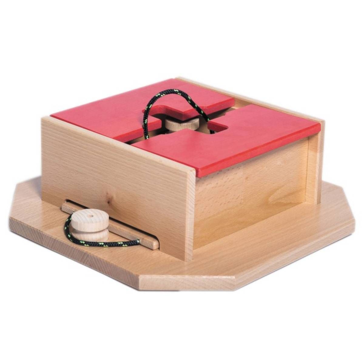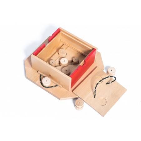 - Підготуйте іграшку: Вставте плитки в нижні пази коробки, два капелюхи в отвори плитки, циліндри в інші отвори, а потім закріпіть плитку з двома циліндрами.