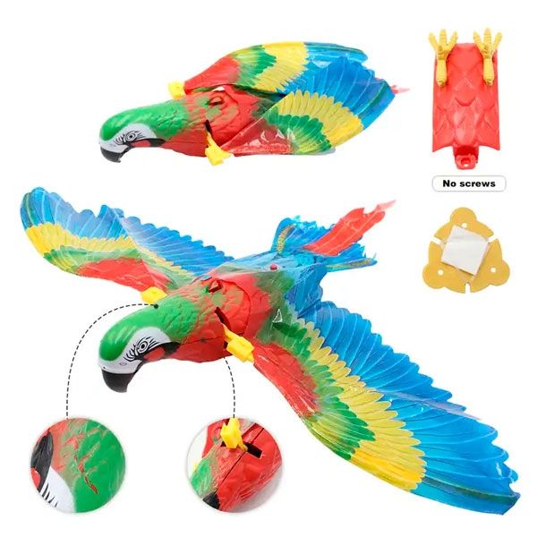 Летючий Папуга - це іграшка для кішок, котів, кошенят.Живлення іграшки здійснюється від 2 батарейок типу АА (не входить до комплекту).Використання:Вставте батарейкиУвімкніть перемикач. Птах почне махати криламиПідвісьте птаха на стелю за допомогою мотузки за гачок.Якщо Ви хочете, щоб птах літав по колу, то потрібно його злегка крутонути