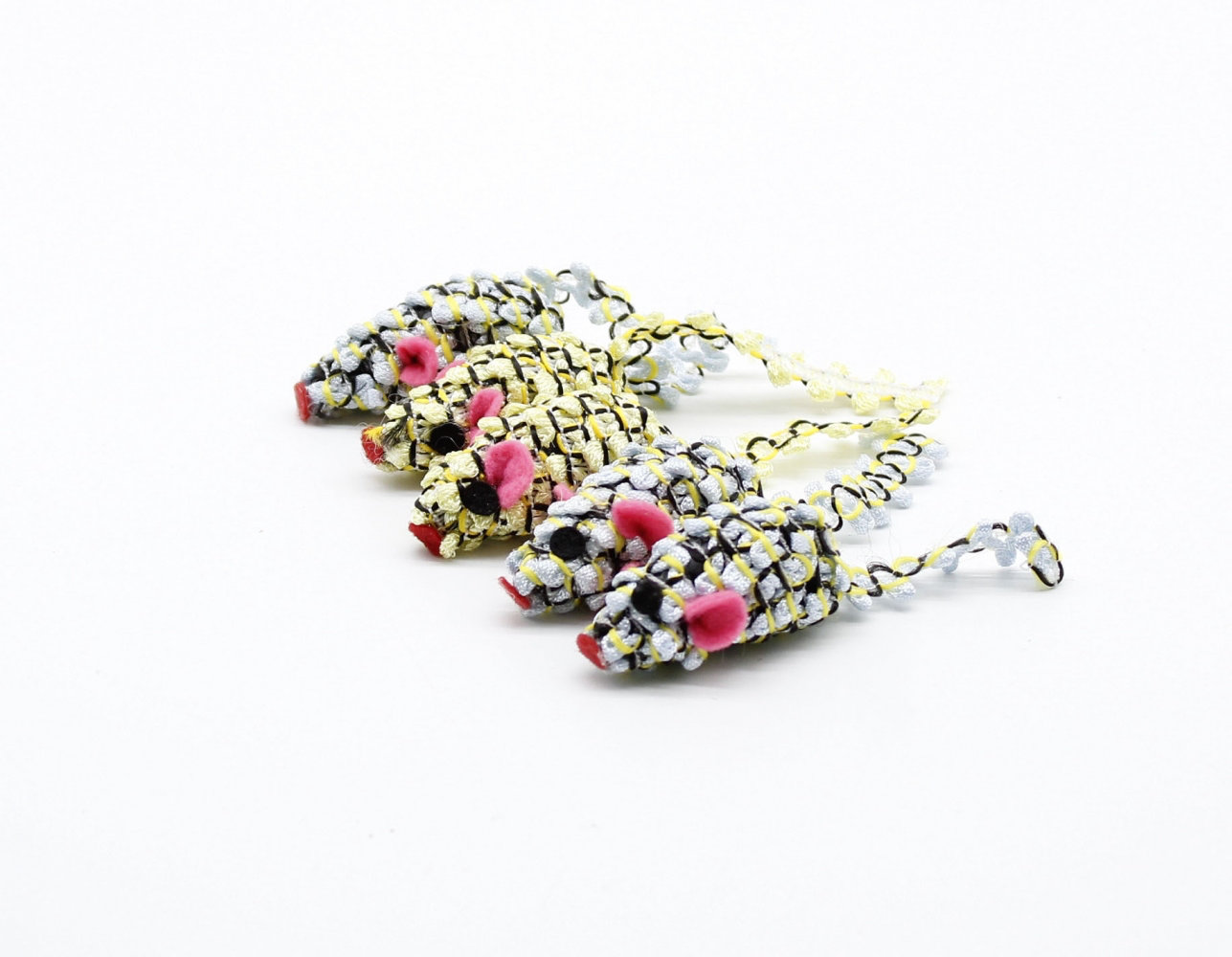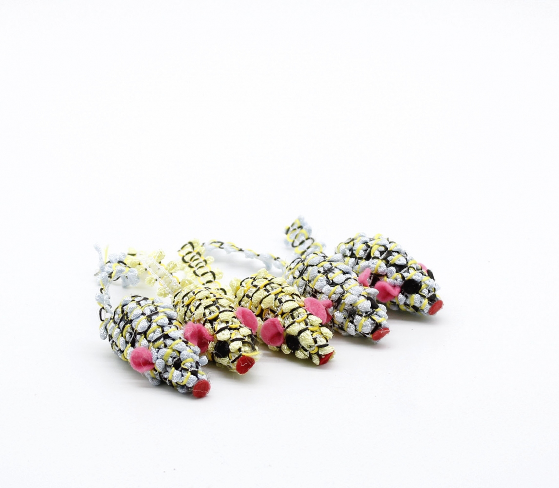 Набір з 5 мишок. Мишки маленькі - 4 см. Виготовлені з букльованої нейлонової нитки, яка обмотана навколо основи. Іграшки яскраві та міцні, і добре чіпляються за кігті кішки. Під час гри видають торохтливий звук.