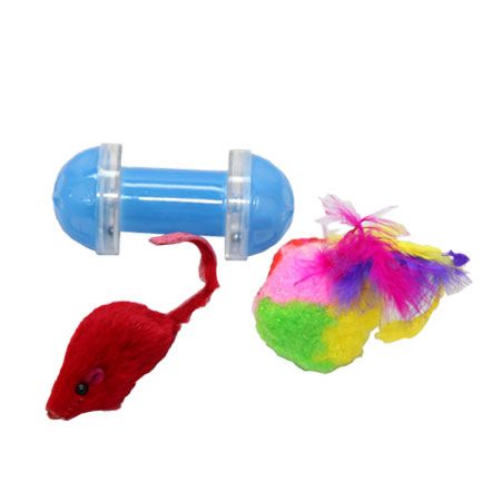 Набір іграшки для кішокСкладається з мякої мишки кольорового хутряного кульки і гантелі.Виконані з безпечних матеріалів для кігтів і зубів вусатого улюбленця.Буде цікавий як кошенятам, так і дорослим котам.В асортименті різні кольори