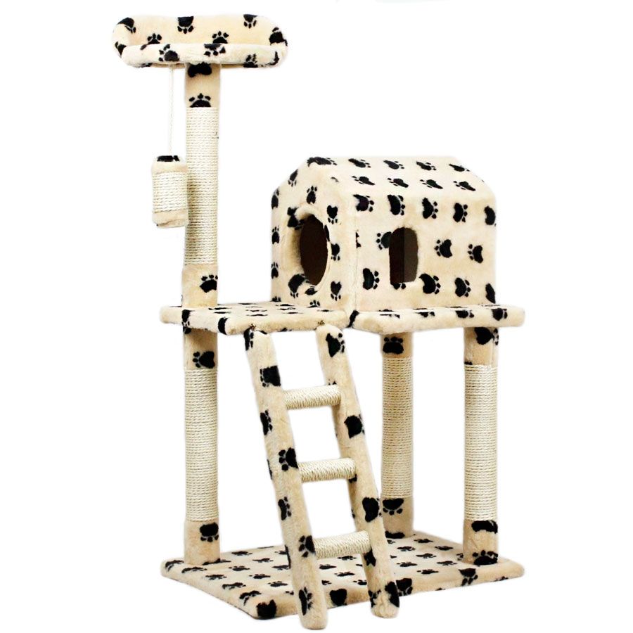 Висота 115 см, довжина 60 см, ширина 40 см.Є 4 стовбчики висотою 50 см діаметром 7 см.Драбинка 11х18х7 см, довжина самих перемичок (вони обробленні чорною ниткою) 14 см.Зверху є відкритий лежак розміром 30х30х7 см, з якого звисає іграшка 15 см, діаметр її 7 см.Також на середній платформі розташован будинок 30х30х35 см, який має вхід 20х20 см і віконце 10х8 см, будинок знаходиться на платформі, розміри її біля входу 25х30х2 см, біля віконця 34х10х2 см