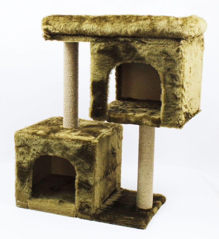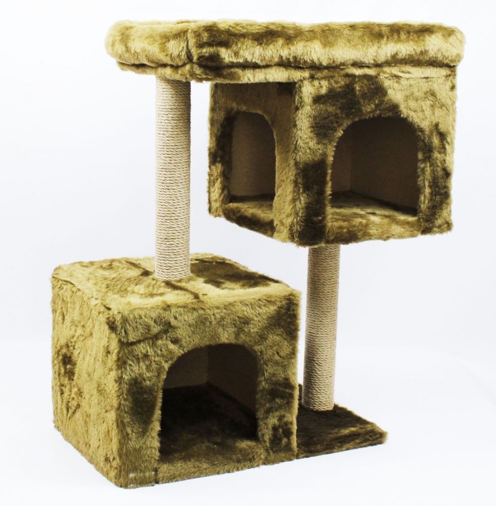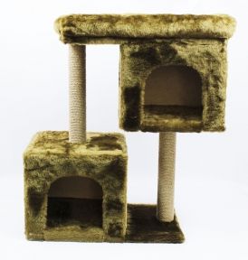 Висота 84 см, ширина 40 см, матеріал хутро, 2 стовпчики по 40 см діаметр 7 см з джуту, розмір верхнього лежака 60408 см, два квадратних будиночки 323535 см, вхід 2522 см.