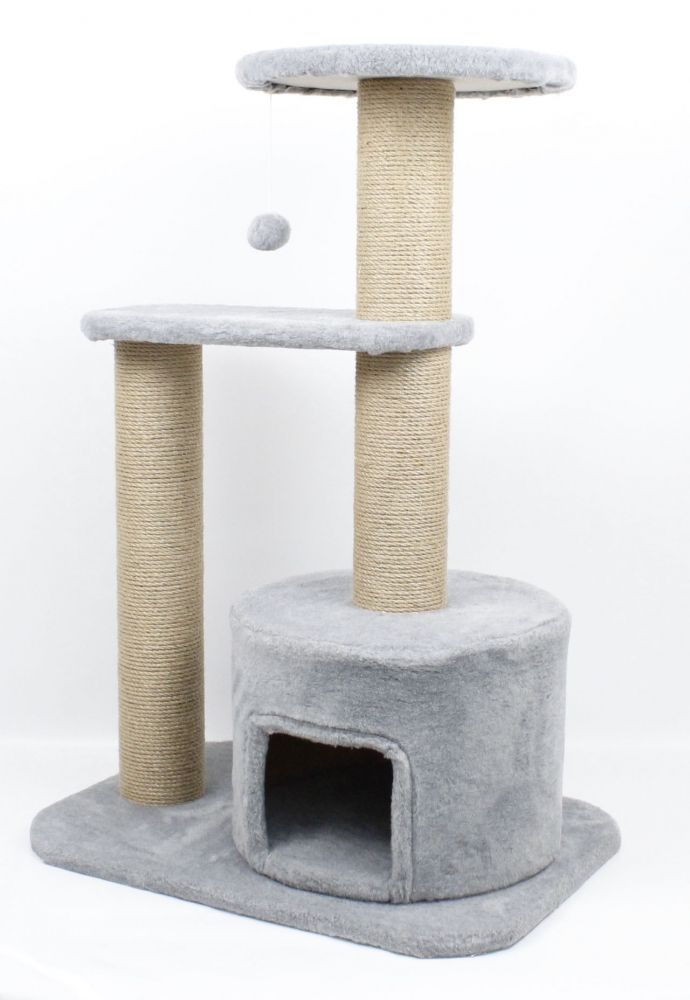 Мурзик Кігтіточка виготовлена зі штучного хутра та дерева, висота 102 см, довжина 70 см, ширина 50 см. Має три поверхи: на першому будиночок 3040 см, вхід 2020см, на другому розташована полиця 50252см, на третьому лежанка 40402см, всі поверхи між собою кріпляться за допомогою стовпчиків, обмотаних джутовою ниткою, 2 шт. діаметр 12 см, висота 30 см і 1 стовпчик 62 см. На драпці є мяка кулька (5 см), яка звисає на нитці 20 см.