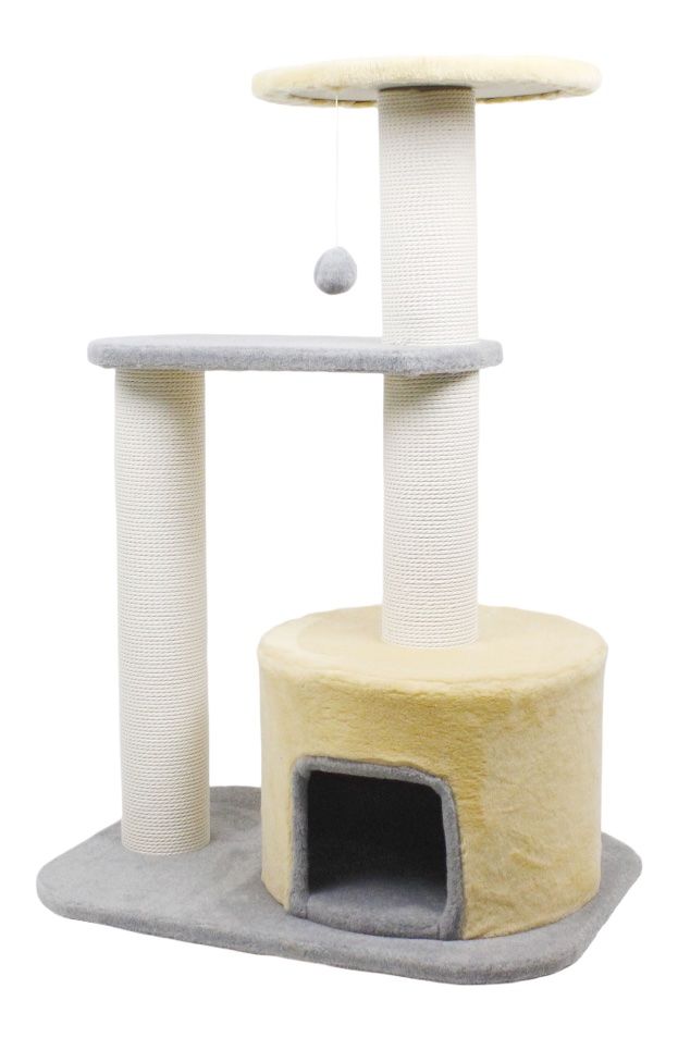 Мурзик дряпка виготовлена зі штучного хутра та дерева, висота 102 см, довжина 70 см, ширина 50 см. Має три поверхи на першому будиночку 3040 см вхід 2020 см, на другому розташована полиця 50252 см, на третьому столі 304. б ниткою 2 шт діаметр 12 см, висота 30 см і 1 стовпчик 62 см. На драпці є мяка куля (5см) яка звисає на нитці 20 см.