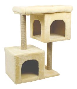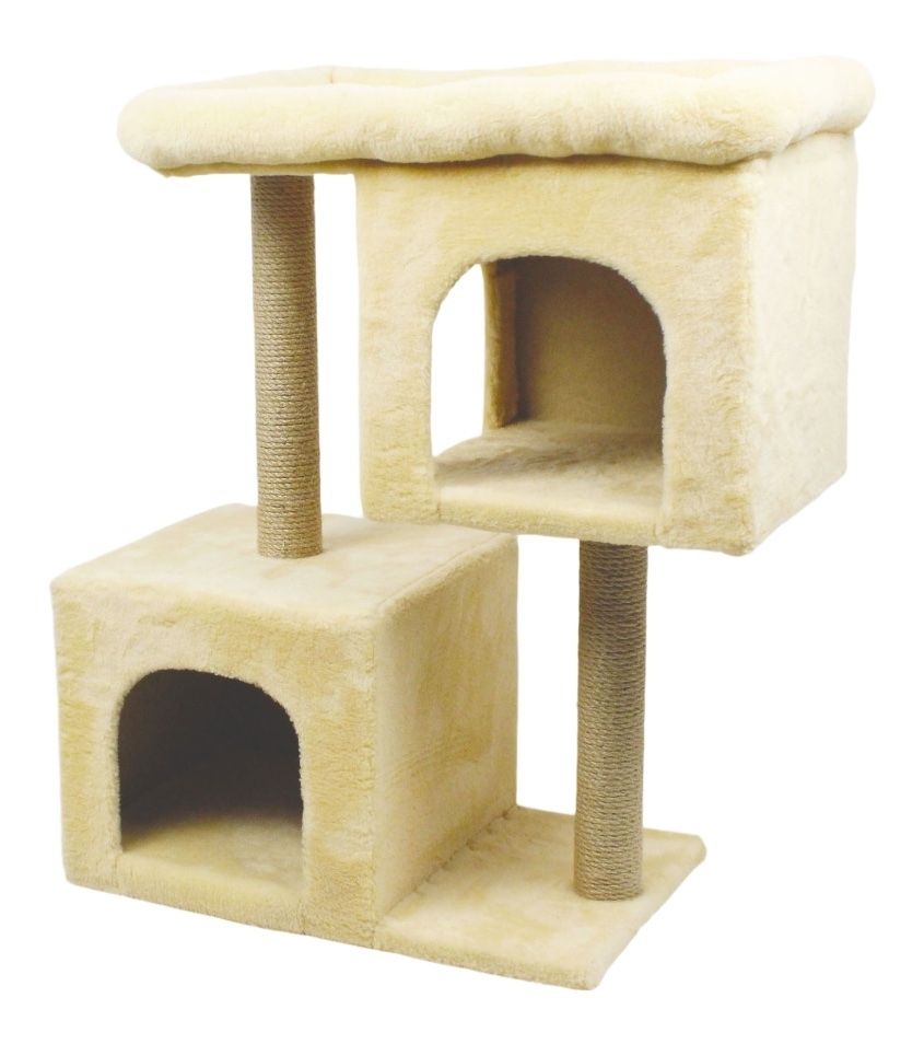 Висота 84 см, ширина 40см, матеріал хутро, 2 стовпчики по 40 см діаметр 7см з джуту, розмір верхнього лежака 60408 см, два квадратні будиночки 323535 см, вхід 2522 см.