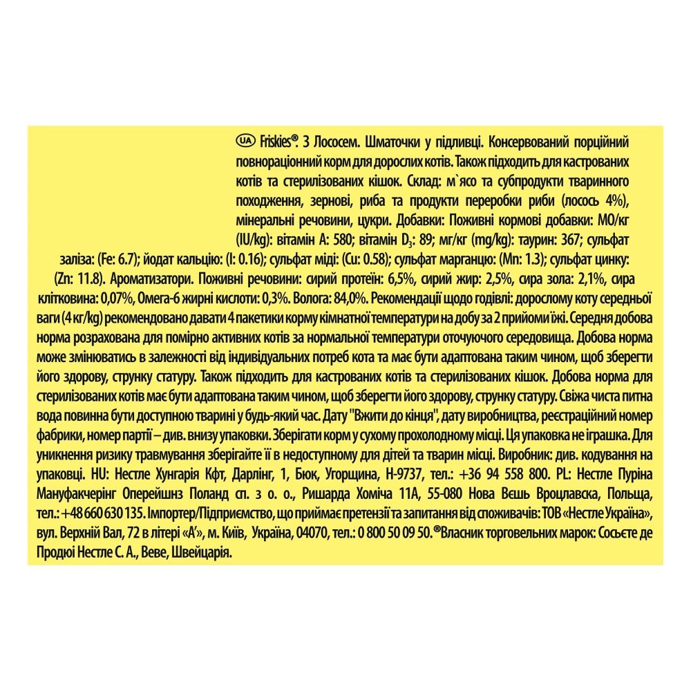 Лосось є не тільки однією з найкорисніших риб, а й однією з найсмачніших. Аромат лососини не можна сплутати ні з чим - він унікальний. Будь-який кіт буде радий такому обіду.Крім лосося,корм Friskiesскладається з інших мясних компонентів, зернових, а також доповнений вітамінами та мікроелементами. Мясні шматочки доповнює смачна підливка, що допомагає підтримувати водний баланс в організмі тварини. Це особливо важливо у спеку.Зручне упакування 85 г є порційним - середньостатистичний кіт зїдає її за один присід, що дуже зручно. Крім того, паучі комфортно брати з собою в дорогу, на дачу, носити в сумці на випадок, якщо на вулиці зустрінеться голодний кіт.Рекомендації щодо годування:дорослому коту середньої ваги (4 кг) рекомендовано давати 4 пакетики корму кімнатної температури на добу за 2 приймання їжісередня добова норма розрахована для помірно активних котів за нормальної температури довкіллядобова норма може змінюватись залежно від індивідуальних потреб кота та має бути адаптована таким чином, щоб зберегти його здорову, струнку статурутакож підходить для кастрованих котів та стерилізованих кішок.Добова норма для стерилізованих має бути адаптована таким чином, щоб зберегти його здорову, струнку статурусвіжа питна вода повинна бути доступною тварині у будь-який час.
