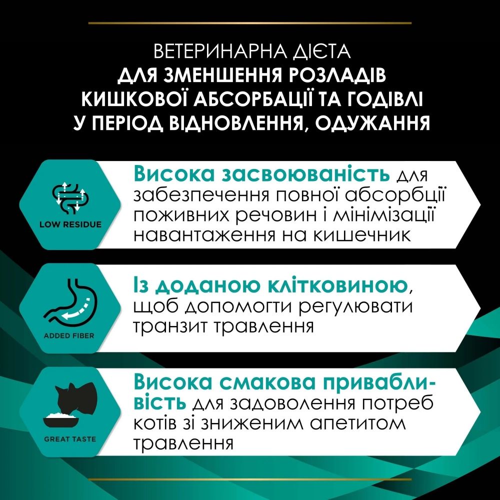Вологий дієтичний корм для кошенят та дорослих котів Purina Pro Plan Veterinary Diets EN Gastrointestinal для зменшення розладів кишкової абсорбації та годівлі у період відновлення та одужання 195 гПро товарВетеринарна дієта для зменшення розладів кишкової абсорбції та годування у період відновлення, одужання.Переваги:Висока засвоюваність для забезпечення повної абсорбції поживних речовин та мінімізації навантаження на кишечник.З доданою клітковиною, щоб допомогти регулювати транзит травлення.Висока смакова привабливість для задоволення потреб кішок зі зниженим апетитом.Рекомендації щодо годування:перед початком чи продовженням терміну використання корму рекомендується консультація ветеринарного лікаря. Слідкуйте за тим, щоб у вашої тварини завжди була свіжа вода.