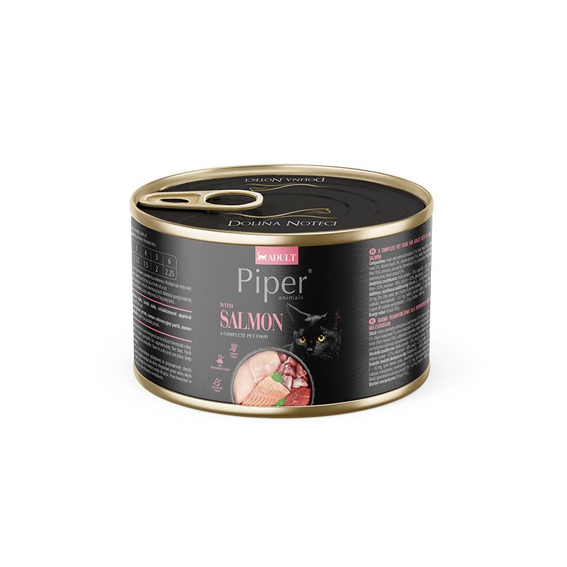 Повнораціонний, збалансований корм Dolina Noteci Piper з лососем для дорослих кішок всіх порід. На 100 задовольняє добову потребу у вітамінах, мінералах і поживних речовинах. Основні переваги та особливості корму: Не містить злаків. Оптимальне співвідношення білків і жирів (116). Унікальна текстура: ніжний рибний паштет з шматочками філе лосося. Висока засвоюваність і підтримка травної системи. Не містить шкідливих консервантів, кукурудзи, сої та пшениці. Підтримує мінералізацію кісток і зубів. Забезпечує правильне протягом всіх метаболічних процесів. Високий рівень EPA і DHA-кислот у складі, які беруть участь у захисних процесах щодо нервової тканини і беруть участь у репродуктивних процесах - їх загальний вміст у кормі становить 1 у загальному пулі жирних кислот. Dolina Noteci Piper - це консерви суперпреміум класу для кішок. Корм збалансований з точки зору змісту поживних речовин на основі сучасних стандартів і правильних рекомендацій по живленню.Інгредієнти (упаковка в білому кольорі): Мясо та продукти тваринного походження 55, бульйон, риба та рибні продукти (10 філе лосося), мінеральні речовини. Інгредієнти (упаковка в чорному кольорі): Мясо та продукти тваринного походження 55 (яловичина 10, куряче філе 5, свинина 5, курячі серця 3, курячі шлунки 3), бульйон, риба та рибні продукти (філе лосося 10), мінеральні речовини, олії та жири (лляна олія 0,2), котовник сушений 0,01. Аналітичний склад: Білки - 11 Жири - 6 Зола - 1,5 Клітковина - 0,5 Кальцій - 0,3 Фосфор - 0,25 Волога - 80. Харчові добавки на 1 кг: Вітамін D3 - 240 МО Вітамін Е - 95 МО Вітамін С - 50 мг Цинк - 13 мг Марганець - 0,5 мг Мідь - 0,2 мг Йод - 0,4 мг Таурин - 800 мг.