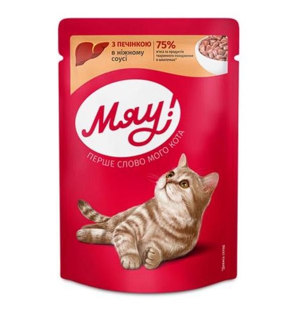Вологий корм для кішок Мяу, печінка в ніжному соусі повнораційний корм для дорослих кішокПереваги та особливості:збалансований раціон із багатим вмістом поживних компонентівсприяє здоровому травленню та забезпечує організм енергією на весь деньмістить вітаміни та мікроелементи, необхідні для підтримки відмінного здоровя та самопочуття коталегко засвоюється, включає багато поживних речовин у поєднанні з відмінним смаком.Склад: мясо та субпродукти тваринного походження, у тому числі печінки не менше 4, злаки, екстракти рослинних білків, мінерали, вітаміни (в т.ч. таурин), цукру.Кормова (поживна) цінність 100 г корму:білок 7 г, жир 4,5 г, зола 2,5 г, клітковина 0,3 г, вологість 82 г.Вміст вітамінів та мінералів:вітамін А 1200 МОкг, вітамін D3 160 МОкг, вітамін Е 5 мгкг, кальцій 3,5 гкг, фосфор 2,5 гкг.Термін придатності 2 роки від дня виготовлення
