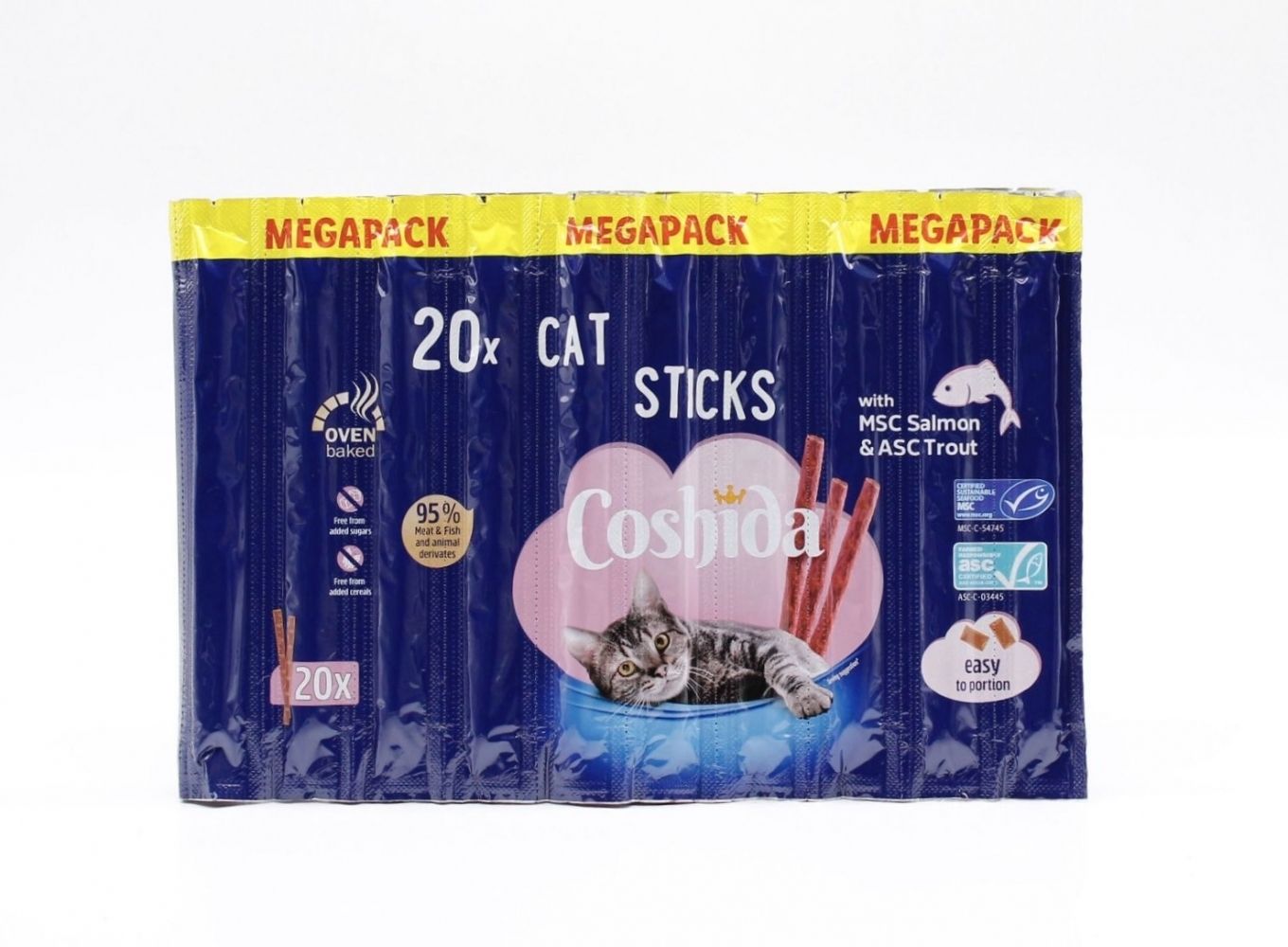 Мясні палички Coshida чудове частування для дорослих кішок, яке подарує вашому улюбленцю неповторні смакові відчуття. Унікальне поєднання добірних сортів мяса, вітамінів, мінералів допоможе йому отримати важливі речовини, корисні для здоровя.Переваги:Ласощі мають в основі 90 мясних компонентів, що надає їм виняткового смаку та високої харчової цінності.До складу додані вітаміни А, D3, E для зміцнення імунітету та амінокислота таурин для підтримки серця та імунної системи.Легко поділяються на порційні шматочки, що дозволяє контролювати порції.Немає штучних ароматизаторів та барвників, без додавання зернових культур.У кожному блістері 20 паличок, кожна у окремому стоку.Зберігання: сухе прохолодне місце при температурі від 0 до 22С та відносній вологості повітря не більше 65Склад: мясо та субпродукти тваринного походження, мінерали.Аналіз складу: білки 33,5, вміст жиру 20,0, сира зола 10,0, сира клітковина 2,0, вологість 28,0.Добавки на 1кг : консерванти, антиоксиданти.Норми годуванняДорослим кішкам 1-2 палички щодня, але не більше 5шт на тиждень. У тварини завжди має бути доступна свіжа вода для пиття.
