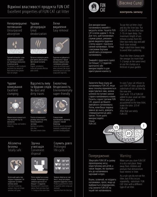 Наповнювач для котячого туалету Fun Cat Oat Power, вівсяний, проти запаху, 5лНовий, безпечний та високоефективний наповнювач преміум - класу для котячих туалетів від тм Fun CatВисокоякісний наповнювач не має аналогів на українському ринку, тому що виконаний виключно з натуральної рослинної харчової сировини (продукти переробки зернових культур), що гарантує:- виняткову безпеку (навіть у разі поїдання)- Екологічність (легко розкладається у природі),- зручність в утилізації використаний наповнювач можна безпечно змивати в унітазКлючових переваги наповнювача FunCatOatPower перед наповнювачами MintpawsтаCornhills:1.Практична форма - пелети середнього розміруТакі пелети майже не розкидаються з лотка, не липнуть до лап і не розносяться на шерсті тварин, а розсипані пелети легко змітаються, не липнуть до підлоги, не забиваються в килими.2. СуперпоглинанняУнікальна волокниста і мікропориста структура, щільність якої на 25-30 нижча, а кількість пор у кілька разів вища, ніж у інших наповнювачів, дозволяє швидко поглинути набагато більше вологи та зберегти форму пелет.3. Чудовий контроль запаху.Поглинувши вологу, волокна розбухають і закривають пори, тим самим надійно утримуючи запах усередині пелети, а органічні молекули циклодекстрини швидко його дезактивують.4. Сухий та чистий лоток.Завдяки високій швидкості вбирання, рідина не встигає дійти до дна лотка, утворюючи невелику округлу грудку, яку легко прибрати. Навіть увібравши багато вологи, грудочки не липнуть до лотка і легко витягуються, полегшуючи чищення лотка. Підтримуйте глибину шару 5 см або більше і лоток довго буде сухим та чистим.5. Економне витрачання.Завдяки більшій поглинаючій здатності, грудочки виходять невеликі, тому втрати наповнювача при збиранні мінімальні, а витрати дуже економні. Експериментально підтверджено, що для утримання однакової кількості вологи витрачається на 25-30 менше наповнювача, ніж кращі зразки інших типів.Ключова особливість наповнювача Oat Power контроль запаху. Він підходить для найчутливіших і найвибагливіших тварин.