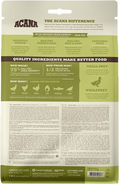 ACANA Grasslands Cat сухий корм для котівКотам необхідніраціони з багатим вмістом мясних протеїнів. Надихаючись нашими великими луками та холодними північними озерами, формула ACANA Grasslands переповнена мясом курчат, індички та качки, вирощених на вільному вигулі, гніздовими яйцями та рибою виловленої в дикій природі. Всі інгредієнти представлені у співвідношенні WholePrey, включаючи мясо, органи, хрящі та їстівні кістки. Наші інгредієнти доставляються на наші кухні свіжими або сирими людьми яких, ми знаємо і яким ми віримо. Ми пропонуємо вашому коту найкращі інгредієнти і рецептури, які допоможуть їм залишатися щасливими, здоровими і сильними.Доступні фасування 340 гр, 1.8 кг, 4.5 кг.Травна системаНаше поєднання високоякісних протеїнів, натуральних джерел клітковини і суміш пробіотиків сприяють підтримці здоровя травної системи.Здорове серце і зірТаурин, ЕПК, ДГК це життєво необхідні нутрієнти для котів, вони необхідні для здоровя серця і очей.Здорове функціонування шкіри та шерстіОмега 3 жирні кислоти допомагають підтримувати здоровя шкіри і блиск шерсті.Жаданий смакМясні інгредієнти в концепції дрібний видобуток і ліофілізування печінка забезпечують неповторний смак корму.Якісні інгредієнти роблять корм кращеЯК БАГАТО МЯСА75Мясні інгредієнти в концепціїДрібна видобутокЄ потужним джерелом ессенціальних протеїнів, вітамінів і мінералівЯК БАГАТО СВІЖОГО МЯСА12 свіже або сире мясо птиці та рибиПереповнене нутрієнтами і неповторним смаком який ваш кіт обовязково полюбитьЯк багато видів мясаКурча, Качка, Індичка, Яйця, Риба.Наші свіжі інгредієнти ми зберігаємо шляхом їх охолодження. Наші сирі інгредієнти заморожуються на піку їх свіжості, зберігаючи тим самим всі необхідні нутрієнти.ІнгредієнтСвіже мясо качки (11), свіже мясо курки (11), свіжі гніздові яйця (8), дегідратованого мясо курки (7), дегідратованого мясо індички (7), дегідратованого мясо білої риби (7), квасоля строката, цілісний горошок, свіже мясо індички (6), жир качки (5), цілісна червона сочевиця, цілісний нут, цілісна зелена сочевиця, цілісна перепілка (4), свіжий лівер курки (печінка, серце) (2), жир минтая (2), свіжий лівер індички (печінка, серце) (2), клітковина сочевиці, дегідратованого мясо качки (1), печінка качки (1 ), хрящі качки (0.5), ліофілізована печінка курки і качки (0.5), висушена ламінарія, свіжа гарбуз, свіжа мускатна гарбуз, свіжа капуста кале, свіжий шпинат, свіжа зелень ріпи, свіжа морква, свіжі яблука, свіжі групи, свіжа журавлина, свіжа чорниця, корінь цикорію, корінь куркуми, розторопша, корінь лопуха, лаванда, корінь алтея, шипшина.ДОБАВКИ (в 1 кг):технологічні: натуральні антиоксиданти. Харчові добавки: холіну хлорид: 1200 мг, таурин 400 мг, цинк (цинку хелат амінокислоти гідрат) 150 мг, вітамін B1: 25 мг, вітамін B2 10 мг, ніацин 50 мг, вітамін B5 8 мг, вітамін В 6 7,5 мг, фолієва кислота 0,75 мг, біотин 0,01 мг, вітамін В12 0,1 мг, вітамін A 1875 МО, вітамін D 250 МО, вітамін E 150 МО, мідь (міді (II) хелат амінокислоти гідрат): 11мг, DL-метіонін: 99 мг. Зоотехнічні добавки: Enterococcus faecium NCIMB10415: 600x10 6 КУО.Енергетична цінність: 3930 ккалкг (472 ккал в мірній склянці 120 г) де джерелом 38 енергії є протеїн, 23 вуглеводи, 39 жир.Гарантований аналіз:Сирий протеїн: 37Жир: 18Клітковина: 3Вологість: 10Зола: 9 Кальцій: 1.9Фосфор: 1.3Омега-6: 2.5Омега-3: 0.8ЕПК: 0.2ДГК: 0.2Магній: 0.1Таурин: 0.1Кошеня:після відлучення (приблизно 5 тижнів) добова норма корму становить 12 м