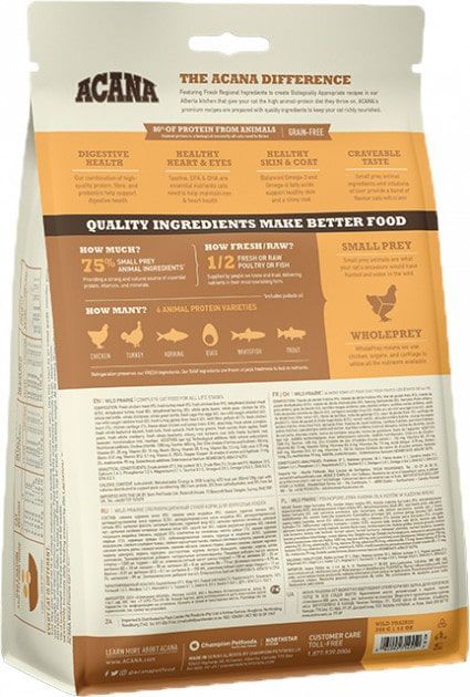 ACANA Wild Prairie Cat сухий корм для котівКотам необхідніраціони з багатим вмістом мясних протеїнів. Надихаючись нашими великими преріями і кришталевими озерами, формула ACANA Wild Prairie переповнена мясними інгредієнтами високої якості: мясом курчат і індички, вирощених на вільному вигулі, гніздовими яйцями і прісноводною рибою виловленої в дикій природі. Всі інгредієнти представлені в співвідношенні WholePrey, включаючи мясо, органи, хрящі і їстівні кістки, щоб ваш улюблений вихованець отримував все необхідне для здоровя, відмінної фізичної форми і благополуччя.Доступні фасування 340 гр, 1.8 кг, 4.5 кг.Травна системаНаше поєднання високоякісних протеїнів, натуральних джерел клітковини і суміш пробіотиків сприяють підтримці здоровя травної системи.Здорове серце і зірТаурин, ЕПК, ДГК це життєво необхідні нутрієнти для котів, вони необхідні для здоровя серця і очей.Здорове функціонування шкіри та шерстіОмега 3 жирні кислоти допомагають підтримувати здоровя шкіри і блиск шерсті.Жаданий смакМясні інгредієнти в концепції дрібний видобуток і ліофілізування печінка забезпечують неповторний смак корму.Якісні інгредієнти роблять корм кращеЯК БАГАТО МЯСА75Мясні інгредієнти в концепціїДрібна видобутокЄ потужним джерелом ессенціальних протеїнів, вітамінів і мінералівЯК БАГАТО СВІЖОГО МЯСА12 свіже або сире мясо птиці та рибиПереповнене нутрієнтами і неповторним смаком який ваш кіт обовязково полюбить.Як багато видів мяса.Курча, Індичка, Риба, Яйця.Наші свіжі інгредієнти ми зберігаємо шляхом їх охолодження. Наші сирі інгредієнти заморожуються на піку їх свіжості, зберігаючи всі необхідні нутрієнти.ІнгредієнтСвіже мясо курки (9), свіже мясо індички (9), свіжа печінка курки (9), дегидратированное мясо курки (8.5), дегидратированное мясо індички (8), дегидратированная оселедець (8), квасоля строката, цілісний горох, курячий жир (6), цільна червона сочевиця, нут, зелена сочевиця, цільні гніздові яйця (4), сира біла риба, виловлена в дикій природі (4), виловлена в дикій природі (4), сирої лівер індички (печінка, серце) (2), клітковина сочевиці, жир минтая (1), свіже куряче серце (1), курячі хрящі (1), ліофілізована печінка курки та індички (0.5), висушена ламінарія, свіжа гарбуз, свіжа мускатна гарбуз, капуста кале, свіжий шпинат, свіжа зелень ріпи, свіжа морква, свіжі яблука, свіжі груші, свіжа журавлина, свіжа чорниця, корінь цикорію, корінь куркуми, розторопша, корінь лопуха, лаванда, корінь алтеї, шипшинаДОБАВКИ (в 1 кг):технологічні: містить природні антиоксиданти. Харчові добавки: Холіну хлорид: 1200 мг, таурин 400 мг, цинк (цинку хелат амінокислоти гідрат: 150 мг, вітамін B1: 25 мг, вітамін B2 10 мг, ніацин: 50 мг, вітамін B5 8 мг, Вітамін B6 7.5 мг, фолієва кислота 0.75 мг, біотин: 0.01 мг, вітамін B12: 0.1 мг, вітамін E 150 МО, мідь (міді (II) хелат амінокислоти гідрат): 11мг, DL-метіонін: 99 мг. Зоотехнічні добавки: Enterococcus faecium NCIMB10415: 600x10 6 КУО.Енергетична цінність:4060 ккал кг (463 ккал в мірній склянці 120 г) де джерелом 34 енергії є протеїн, 24 вуглеводи, 42 жир.Гарантований аналіз:Сирий протеїн (хв.): 37Жир (хв.): 18Клітковина (Макс.): 3Зола (макс.): 9Таурин (хв.): 0.1Вологість (макс.): 10Кальцій (хв.): 1.9Фосфор (хв.): 1.3Омега-6: 2.5Омега-3: 0.8ЕПК (хв.): 0.2ДГК (хв.): 0.2Магній (хв.): 0.1Кошеня:після відлучення (приблизно 5 тижнів) добова норма корму становить 12 мірної склянки (60 г) на 1 кг маси тіла з 20-тижневого віку (приблизно з 5 місяців) добова норма корму с
