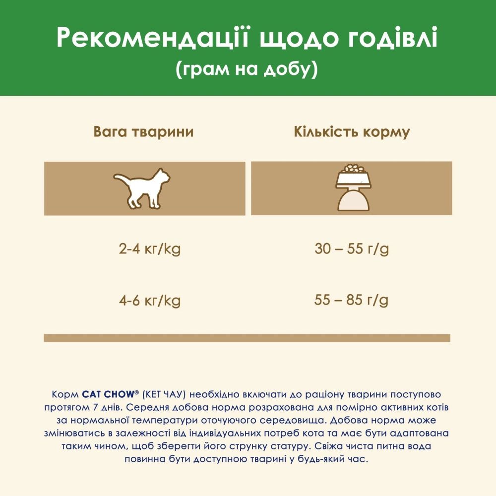 Сухий корм для стерилізованих котів Cat Chow Sterilisedна 100 повнораціонний та збалансований, без додавання штучних барвників.З 1926 року експерти Purina досліджували питання природних потреб домашніх улюбленців, щоб розробити повнораціонний корм, який підтримуватиме їх здоровя та відмінне самопочуття. Щодня на наших фабриках ми робимо декілька сотень перевірок якості продукції, тож ви можете бути впевнені у якості, на яку ви очікуєте. Завжди.Формула сухого корму Cat Chow ретельно створювалася, аби 50 білків (від загальної кількості протеїнів) у складі були тваринного походження, а натуральні інгредієнти у складі продукту робили продукт ще більш апетитним та смачним.Особливості:на 100 повнораціонний і збалансований корм, без додавання штучних барвниківдбайливо створений на 50 з білків тваринного походження і з вмістом натуральних інгредієнтівформула, збагачена цикорієм, що є натуральним пребіотиком, допомагає поліпшити процес травлення вашого котаформула з необхідним рівнем білків і жирів допомагає зберігати мязи міцними та підтримувати здорову вагуспеціально розроблений, щоб допомогти врівноважити вплив гормональних змін, повязаних зі стерилізацієюкастрацією.Рекомендації щодо годівлі:див. таблицю на упаковці. Перший стовпчик Вага тварини (кгkg), другий стовпчик Кількість корму (грам на день). Корм для котів Cat Chow необхідно включати до раціону тварини поступово протягом 7 днів. Середня добова норма розрахована для помірно активних котів за нормальної температури оточуючого середовища. Добова норма може змінюватись в залежності від індивідуальних потреб кота та має бути адаптована таким чином, щоб зберегти його струнку статуру. Свіжа чиста питна вода повинна бути доступною тварині у будь-який час.