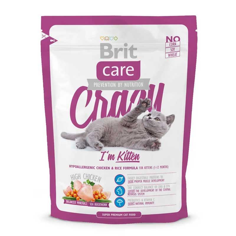 Вдосконалена серія кормів супер-преміум класу Brit Care Cat відрізняється новим підходом до розробки і створення особливо смачних і корисних раціонів для кішок.Всі інгредієнти ретельно підібрані і виготовлені особливим чином, що дозволяє зберегти їх корисні властивості.Кожна формула унікальна і відповідає індивідуальним котячим потребам, адже кожна кішка - це індивідуальність, зі своїм особливим способом життя і перевагою в їжі.Особливості нових раціонів Brit Care Cat:Використання гіпоалергенних, швидко і легко засвоюваних інгредієнти: курка, індичка, лосось, олень і рис.Всі компоненти ретельно підібрані і додані в правильній пропорції, за рахунок чого ймовірність появи алергії або харчової непереносимості - мінімальна.Всі раціони мають особливо привабливим ароматом, адже кішки в першу чергу реагують на запах їжі, а не на смак.Кожна формула Brit Care піклується про здоровя травної системи кішок і сприяє зміцненню імунітету за рахунок вмісту MOS і FOS. MOS (манан-олігосахариди) необхідні для підтримки оптимального балансу мікрофлори та уповільнення розвитку патогенних бактерій в кишечнику. FOS (фрукто-олігосахариди) створюють особливий захисний шар на стінках товстого кишечника і дають живильне середовище для розмноження корисної мікрофлори, що є запорукою відмінного імунітету у кішок.До складу Brit Care Cat включили збалансований комплекс з жирних кислот Омега-3 і-6, цинг і мідь в хелатній формі, що забезпечує здоровя шкіри і красу вовни.Спеціальний комплекс антиоксидантів (вітамін Е, С, органічний селен) активно звязує продукти окислення в організмі, забезпечує відмінне здоровя дорослих кішок, а також уповільнює процеси старіння.Brit Care Cat Crazy Kitten - високоякісний гіпоалергенний корм з куркою та рисом для кошенят.Переваги:Повноцінне харчування для кошенят, заповнює потреби в поживних речовинах, вітамінах та мікроелементах.Містить гіпоалергенні легкоперетравлювані інгредієнти, піклується про здоровя травної системи і зміцнює імунітет.Багатий рідкими речовинами, які важко відтворити в природному годуванні.Забезпечує здоровий ріст і розвиток кошеня, покращує здатність навчатися.Містить екстракт Юки Шідігера для підтримки роботи травлення.Склад корму:Дегидрированная курка (25), філе курки (22), рис, курячий жир (консервирован токоферолами), рисовиеотруби, сушені яблука, лососеве масло (3), куряча печінка (2), пивні дріжджі, мананоолигосахариди (165 мгкг), фруктоолігосахариди (135 мгкг), екстракт юки Шідігера (Yucca Schidigera) (90 мгкг), обліпиха крушиновидна (50 мгкг).