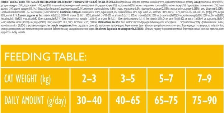 Brit Care Cat Grain-Free Haircare Healthy and Shiny Coat Беззерновий гіпоалергенний сухий корм для кішок зі складним доглядом за вовною Свіжий лосось і куркаСВІЖИЙ ЛОСОСЬ, КУРИЦЯ, НАСІННЯ ЛЬОНУ - Натуральні джерела жирних кислот омега-3 та омега-6 допомагають підтримувати блиск вовни та здоровя шкіри.КЛІТЧАТКА - сировина, багата на клітковину, сприяє плавному проходженню трихобезоарів. Сира клітковина викликає почуття ситості, що призводить до зниження споживання їжі та контролю ваги.ПРОБІОТИКИ ТА АНТИОКСИДАНТИ зміцнюють імунну систему та підтримують здорове травлення.БЕЗ зернових БЕЗ барвників БЕЗ консервантів БЕЗ ГМО БЕЗ сої