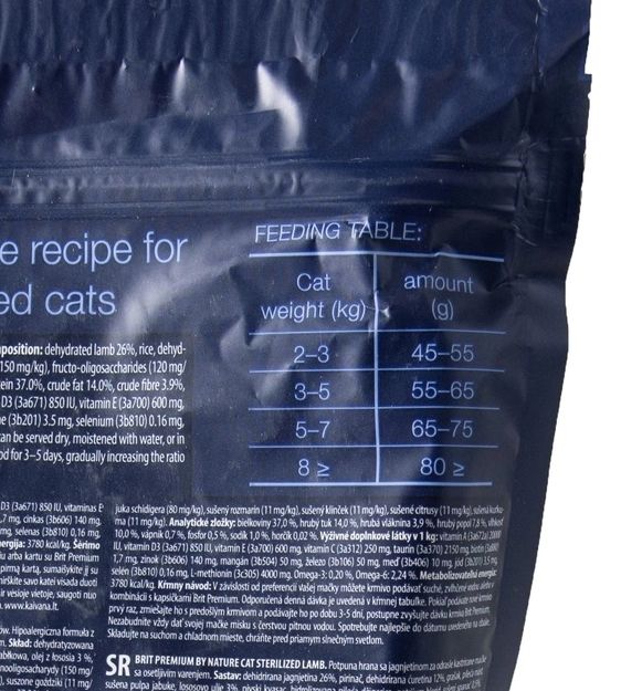 Повноцінний корм преміумкласу з гіпоалергенною рецептурою для стерилізованих кішок. Смачний та апетитний корм з мясом ягняти та цінними натуральними інгредієнтами для щоденного здорового харчування вашого улюбленця.Особливості корму:Гіпоалергенна формула для кішок з харчовою непереносимістюОптимальний pH сечі забезпечує здоровя сечового трактуЗ мякоттю яблука натуральним джерелом клітковиниЗ розмарином, гвоздикою, куркумою та цитрусовими природними антиоксидантамиЗ пребіотиками для делікатного та здорового травлення та для відмінного засвоєння всіх компонентівБЕЗ пшениці БЕЗ сої БЕЗ кукурудзиЕнергетична цінність: 3780 ккалкг.Склад:ягнятина дегідрована 26, рис, індичка дегідрована, 12, горох, курячий жир, сушена яблучна мякоть, лососева олія 3, пивні дріжджі, гідролізована куряча печінка, хлорид натрію, сушений шпинат0. ), фруктоолігосахариди (120 мгкг), юкка Шидігера (80 мгкг), сушений розмарин (11 мгкг), сушена гвоздика (11 мгкг), цитрусові сушені (11 мгкг), сушена куркума (11 мгкг).Аналітичні компоненти: сирий білок 37.0, сирий жир 14.0, вологість 3.9, сира зола 7.8, клітковина сира 10.0, кальцій 0.7, фосфор 0.5, натрій 1.0, магній 0.02.Харчові добавки на 1 кг: вітамін А (3a672a) 20000 МО, вітамін D3 (3a671) 850 МО, вітамін E (3a700) 600 мг, вітамін C (3a312) 250 мг, таурин (3a370) 2150 мг. , цинк (3b606) 140 мг, марганець (3b504) 50 мг, залізо (3b106) 50 мг, мідь (3b406) 10 мг, йод (3b201) 3.5 мг, селен (3b810) 0.16 мг L-метіон . Омега-3:0.20, Омега-6:2.24