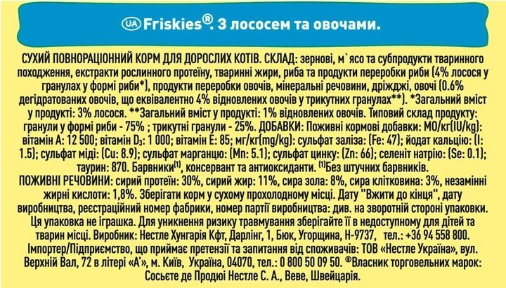 Фріскіс Лосось - Сухий корм для котівПовноцінний збалансований корм для котівПовністю задовольняє потреби котів у їжіСприяє яскравості та блиску шерстіПідтримує гострий зірЗабезпечує вашого улюбленця необхідними мінералами та вітамінамиПід час годування сухим кормом у кішки завжди має бути свіжа водаСклад:Злаки, мясо та субпродукти тваринного походження (10), рослинний білок, олії та жири, риба та продукти перероблення риби (мін. 4 лосося), продукти перероблення овочів, овочі, мінеральні речовини, дріжджі. Вітаміни А, D3, Е, В1, таурин Протеїн - 30 Жир - 10.Виробник: Purina, Угорщина