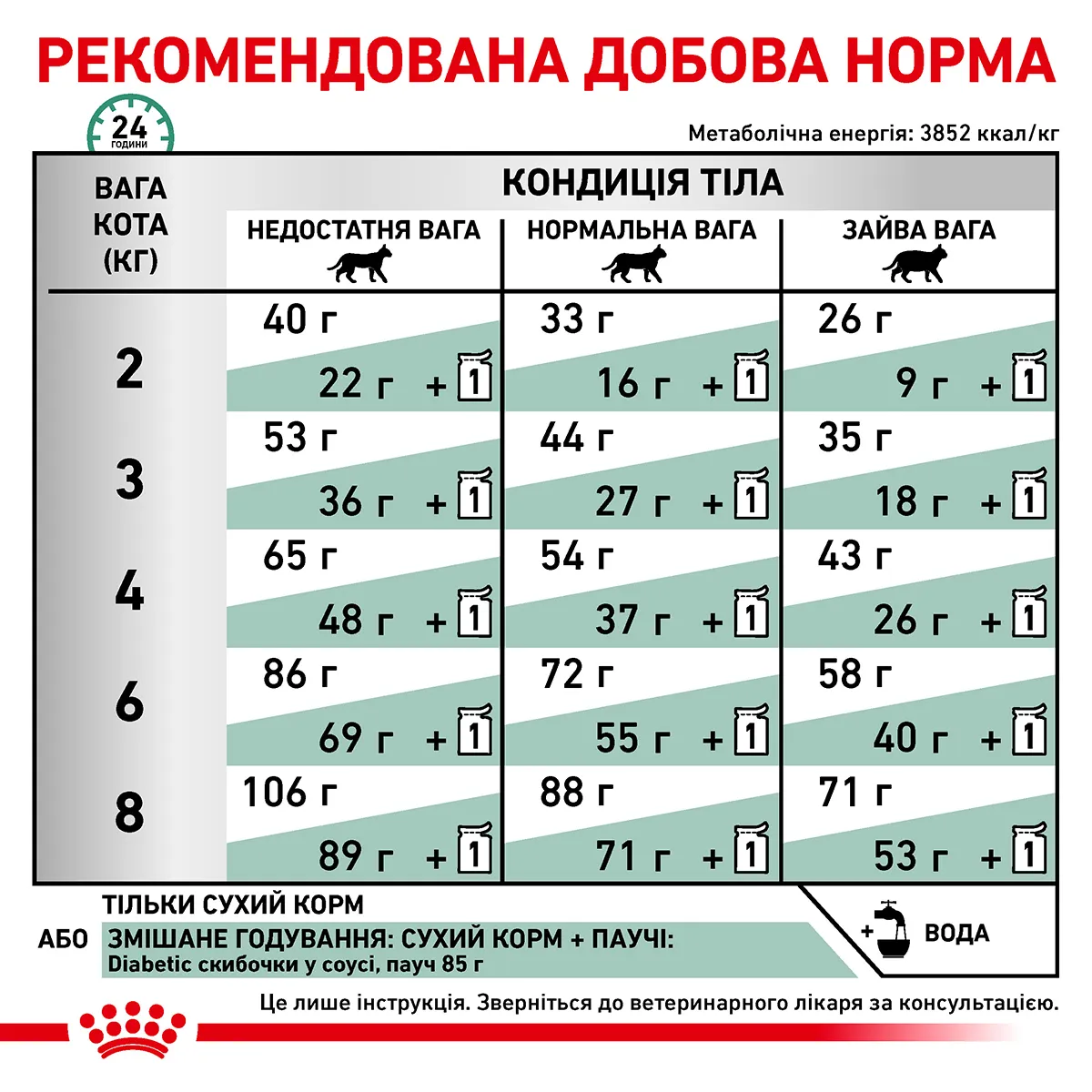 | Вага кота, кг | Недостатня вага | Нормальна вага | Надлишкова вага |