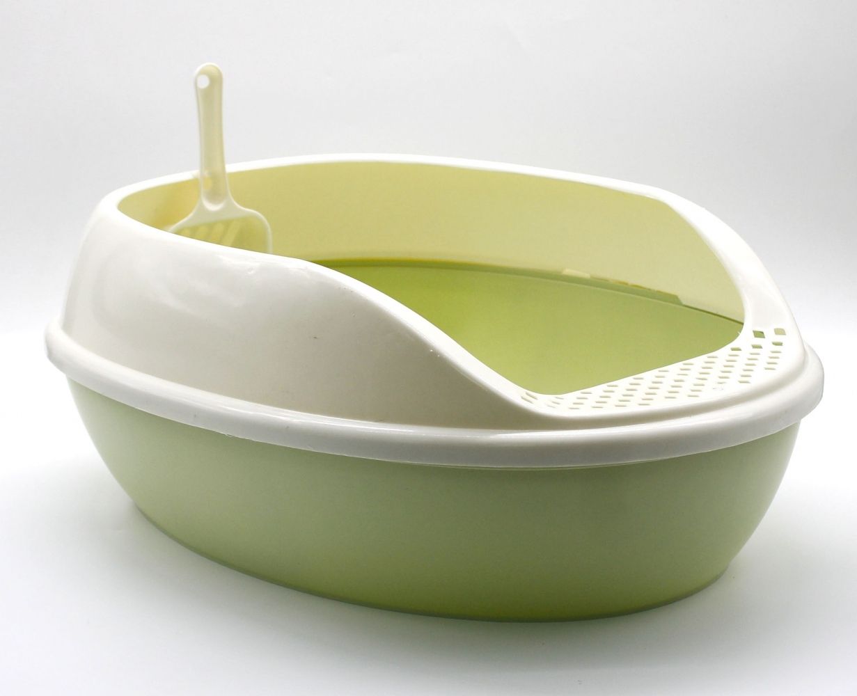 Туалет для кішок пластиковий, розмір 534020см Матовий, овальної форми з бортиком, на якому є отвори, колір оливковий, з лопаткою.