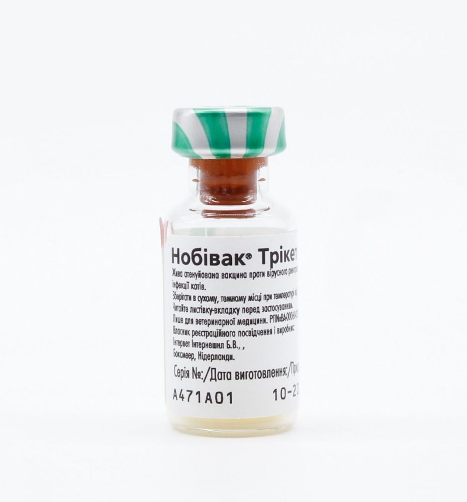 Опис Нобівак трикет триоНобивактрикеттрио вакцина, що виробляє імунітет у кішок отринотрахеита,калицивирозаи панлейкопенії (чума).Проводиться медикамент у формі висушеної живої вакцини рожевого кольору, яка пригнічує вірусів-збудників перелічених хвороб. Разом з нею треба купити рідину для приготування розчину для інєкцій НобивакДилуент. Діюча речовина розчиняється без осадка. Розчинник являє прозору рідину.Вакцина для кішок розфасована за допомогою вакуумної упаковки, герметично закрита гумовими кришками, закріпленими алюмінієвим обідком. Флакони установлени в коробки по 10 или 25 штук. Вещество содержится массой 1 см. куб., растворитель 1 мл.С момента випуска вакцину используют не позднее 33 месяцев, после чего утилизируют, так как она становится непригодной. Средство с утерянной, испорченной етикеткой, нарушением герметичности, кипятят 20 минут с водой, утилизируют.Нобивактрикеттрио купить можно в аптеке для животних по рецепту врача. Хранится средство в холодном месте при температуре 2 - 8 градусов. Растворитель хранится при 2 - 25 градусах. До медикаменту виключається доступ дітям.Інструкція по применениюНобивактрикетвводится кішкам віком вісім тижнів. Тварин, яких щеплять вперше, вакцинують двічі, другий укол через чотири тижні.Імунітет кринотрахеиту,калицивирозувирабативается через 10 днів після другого уколу і тримається рік. До панлейкопенії тварина стійко три роки. Медикамент не має лікувальні властивості, нешкідливий.Інструкція забороняє застосовувати препарат вагітним і годуючим тваринам. Протипоказано вакцинувати хворих, ослаблених тварин. Если кошечку прививают впервие, то требуется еще одна инъекция через три-четире недели. Следующий укол делают через год.При помощи шприца в ампулу с сухим препаратом вливают раствор для инъекций, встряхивают до растворения осадка, вводят кошке под кожу. Место укола предварительно обрабативают медицинским спиртом или другим дезинфицирующим раствором. Нельзя нарушать схему применения, т.к. происходит ослабление воздействия на организм. Если пропущени сроки, вакцинацию проводят как можно скорее. Не следует пугаться, если на следующий день появится небольшой отек места укола. Він зникне мимовільно через пару днів.Побічних ефектів від застосування виявлено не було.Дозволяється використання спільно з НобивакRabies, але з різних шприців.