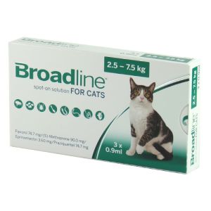 Бродлайн (Broadline) від бліх та кліщів для кішокСКЛАД І ФОРМА ВИПУСКУБродлайн спот-він являє собою прозору безбарвну або жовтуватого кольору рідина. Препарат випускають розфасованим по 0,3 і 0,9 мл у пластикових шприцах-аплікаторах. Шприц-аплікатор 0,3 мл містить в якості діючих речовин: фіпроніл 25 мг, S-метопрен 30 мг, еприномектин 1,2 мг, празиквантел 25 мг, а також допоміжні речовини (бутилгидрокситолуол 0,3 мг, стабілізований гліцерол формально 75 мг, диметилизосорбитол 185 мг). Шприц-аплікатор 0,9 мл містить в якості діючих речовин: фіпроніл 75 мг, S-метопрен 90 мг, еприномектин 3,6 мг, празиквантел 75 мг, а також допоміжні речовини (бутилгидрокситолуол 0,9 мг, стабілізований гліцерол формально 225 мг, диметилизосорбитол 584 мг).СВІДЧЕННЯПризначають кішкам для лікування і профілактики ентомозов, нематозов, цестодозов, а також викликаються іксодовими кліщами акарозов для профілактики дирофіляріозу, що викликається личинками Dirofilaria immiti і в комплексній терапії алергічного дерматиту, спричиненого блохами.ФАРМАКОЛОГІЧНІ ВЛАСТИВОСТІПрепарат відноситься до комбінованих протипаразитарний лікарських препаратів. Вхідні до складу препарату активні компоненти забезпечують його широкий спектр дії щодо екто - і ендопаразитів кішок. Після нашкірного нанесення препарату, протягом перших днів після обробки, діючі речовини фіпроніл та (S)-метопрен поширюються по шкірно-волосяного покриву кішки практично не всмоктуючись в системний кровотік, і надають контактна инсектоакарицидное дію до 42 діб. Эприномектин і празиквантел добре всмоктуються через шкіру і досягають максимальної концентрації в плазмі крові протягом 48 і 6 годин після обробки відповідно.Бродлайн Спот-Він активний відносно: блох волосоїдів іксодових кліщів шлунково-кишкових нематод (личинки, статевонезрілі і дорослі форми) нематод сечового міхура легеневих нематод личинок дирофілярій цестод (всі фази розвитку).ДОЗИ І СПОСІБ ЗАСТОСУВАННЯПрепарат застосовують кішкам одноразово шляхом зовнішнього топікального нанесення на суху, неушкоджену шкіру, використовуючи шприци-аплікатори різної фасовки. Розсунувши шерсть по середній лінії шиї між основою черепа і лопатками, вилити весь вміст шприца-аплікатора безпосередньо на шкіру в одне місце. З урахуванням маси оброблюваної кішки вибирають шприц-аплікатор або їх комбінацію у відповідності з таблицею.Маса кішки (кг)Доза препарату (мл)до 2,50,32,5-7,490,97,5-9,90,3+0,910,0-15,00,9+0,9Однократна обробка кішки забезпечує знищення:блох протягом 24 годинкліщів протягом 48 годинпоява бліх у приміщенні (місцях утримання тварин) протягом 8 тижнів.Повторні обробки проводять з інтервалом в 1 місяць. Не слід мити й купати тварину протягом 48 годин після нанесення препарату.При частому (частіше 2 разів на місяць) миття кішки з миючим засобом, обробку можна повторити через 2-2,5 тижні.Препарат дозволений до застосування здоровим кішок і кошенят з віку 7 тижнів іабо масою більше 0,6 кг.Вагітним та лактуючим кішкам при необхідності застосовують під контролем лікаря.ПОБІЧНІ ДІЇПри застосуванні лікарського засобу згідно з інструкцією ускладнень не виявлено. При передозуванні препарату у кішки можуть спостерігатися неврологічні симптоми, зникають спонтанно протягом доби і не потребують застосування лікарських засобів.ПРОТИПОКАЗАННЯПротипоказань для застосування препарату не вс
