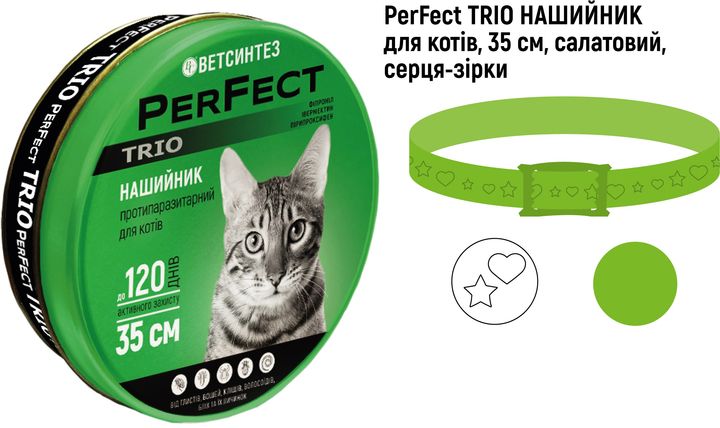 Нашийник PerFect TRIO ефективний засіб, що захищає котів не лише від бліх, кліщів та інших комах, а й від гельмінтів. Це полімерна стрічка з пряжкою, яка має специфічний запах діючих речовин. Нашийник проявляє виражену інсекто-акарицидну дію проти личинок і дорослих форм бліх, вошей, кліщів, волосоїдів, кишкових нематод та личинок дирофілярій.Діючі речовини:Фіпроніл блокує нервові імпульси у паразитів, викликаючи їх загибель, не впливаючи на ЦНС ссавців.Пірипроксифен порушує розвиток личинок і яйцекладку, зупиняючи відтворення популяції.Івермектин блокує передачу нервових імпульсів у нематод і кліщів, що призводить до паралічу та загибелі.Особливості та переваги:Захист від кліщів до 3 місяців.Від комах до 4 місяців.Від гельмінтів до 2 місяців.Початок дії проти кліщів через 48 годин.Має специфічний запах.Доступний у різних кольорах.Показання:профілактика та лікування уражень блохами, вошами, волосоїдами, іксодовими та саркоптоїдними кліщами, нематодами, личинками дирофілярій, а також захист від укусів комарів (Aedes, Culex, Anopheles).Протипоказання:Підвищена чутливість до компонентів.Не застосовувати виснаженим, хворим тваринам.Заборонено кошенятам до 2 місяців.Не застосовувати під час вагітності та лактації.Токсичний для риб і бджіл.Форма випуску:стрічка довжиною 355 см у поліетиленовій упаковці, вторинна упаковка бляшана банка.