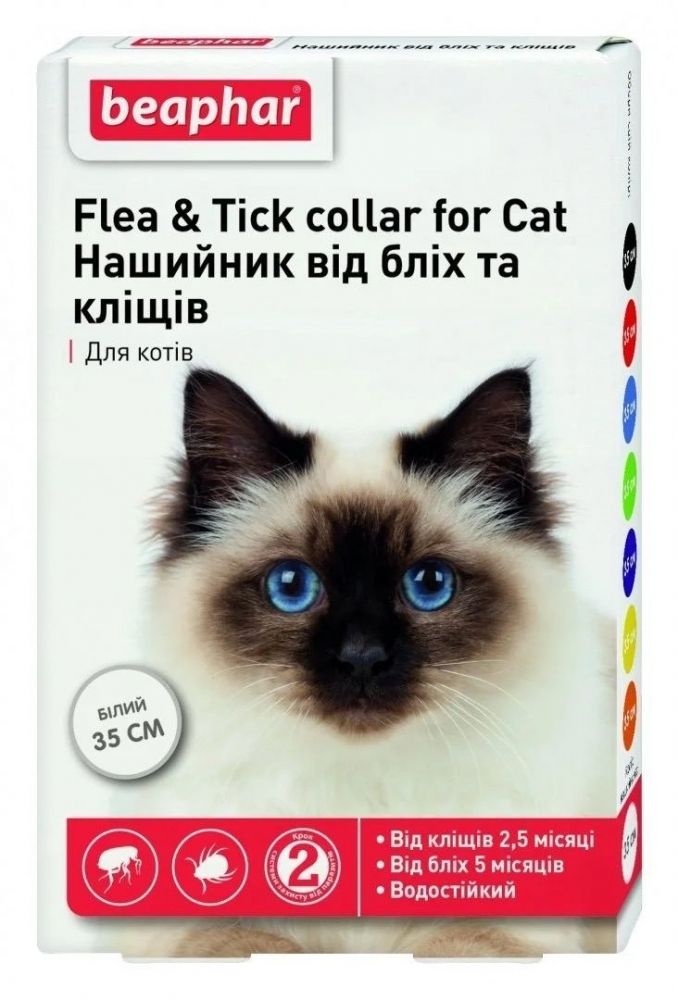 Нашийник Беафар від бліх і кліщів для котів та кошенят віком від 6 місяців. Нашийник являє собою поліхлорвінілову стрічку з фіксатором і насічками, які сприяють моментальному розтягуванню ошийника і швидкому звільненню тварини. Колір нашийника білий, нашийник водостійкий, довжина 35см. Знищує паразитів і захищає від повторного зараження блохами протягом 5 місяців і кліщами 2,5 місяці. Діазинон в складі нашийника виділяється з поверхні стрічки, переноситься на шкірно-шерстний покрив тварини і накопичується в епідермісі, волосяних цибулинах, сальних залозах. Поступово вивільняючись на поверхню шкіри разом з секретом залоз, діазинон має інсектоакарицидну і репелентну дію на бліх, вошей, волосоїдів та кліщів, що паразитують на тваринах. Механізм дії призводить до паралічу та загибелі паразитів.Після розкриття упаковки нашийник розгортають і надягають на тварину, підганяючи за розміром так, щоб між шиєю тварини і нашийником залишався проміжок 1,01,5 с см, потім закріплюють фіксатором, а надлишок стрічки зрізають. По закінченню всіх дій з нашийником, вимийте руки з милом. Починає ефективно діяти через 5 7 діб від початку застосування. Протипоказання: не застосовувати з іншими інсектицидними препаратами, не застосовувати нашийник хворим і видужуючим тваринам, годуючим і вагітним тваринам, тваринам, що мають великі ушкодження шкіри. Також не застосовувати цуценятам молодше 6-місячного віку. Побічні ефекти: як правило, при умові застосування нашийника згідно інструкції, побічних явищ і ускладнень не спостерігається. Можливі випадки підвищеної індивідуальної чутливості тварини до діазинону надмірне слиновиділення, сльозотеча, ознаки подразнення шкіри. В таких випадках використання нашийника припиняють, а тварину слід вимити з милом і змити шерсть великою кількістю проточної води, а при необхідності призначити антигістамінні і симптоматичні засоби.