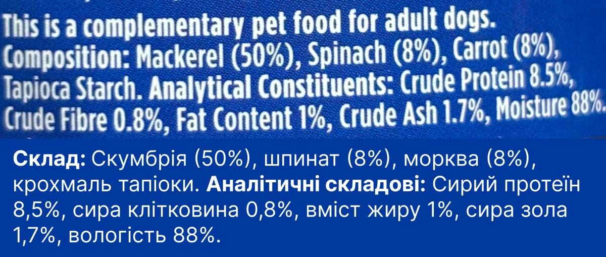 - Натуральні інгредієнти – скумбрія, шпинат і морква без штучних домішок