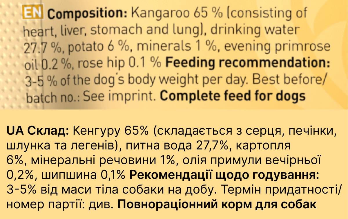 - Без формованого м'яса, м'ясного борошна, глютена, сої, цукру, атрактантів, штучних барвників, ароматизаторів та консервантів: натуральний смак та користь без зайвих добавок.