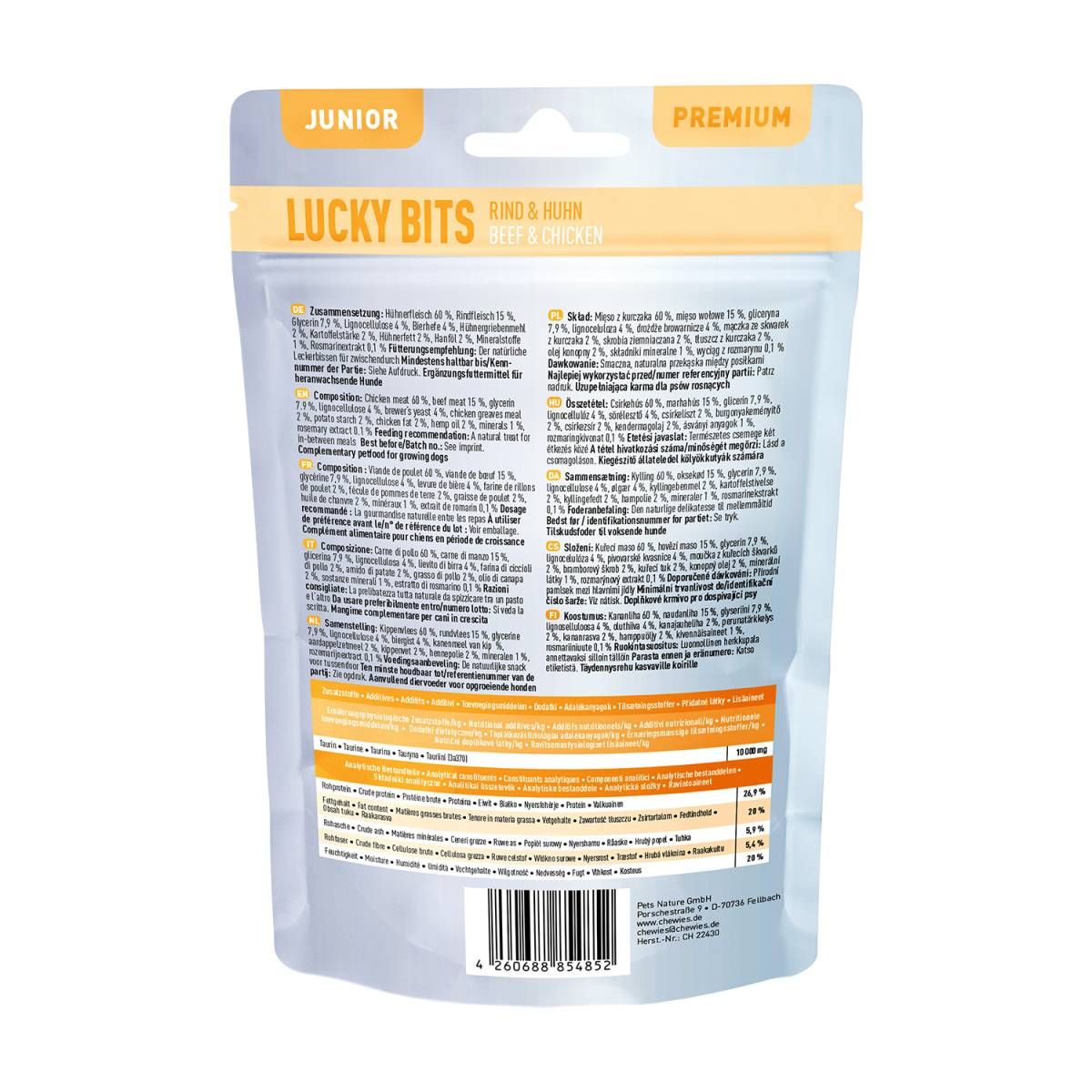 Chewies Lucky Bits з яловичини та курки – це смачні та корисні ласощі, спеціально розроблені для цуценят. М'ясо яловичини та курки забезпечує вашого маленького друга необхідними поживними речовинами для росту та розвитку. Ласощі легко засвоюються та не містять штучних добавок, що робить їх ідеальним перекусом для молодих собак.