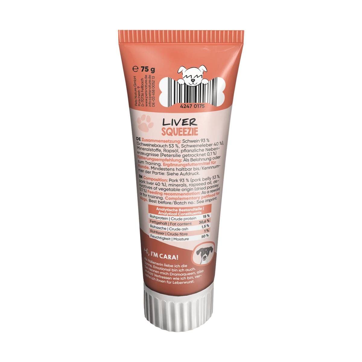 Yummeez Leber Squeezie — це смачні кремоподібні ласощі для собак, що мають зручну форму тюбика для легкого дозування. Цей продукт ідеально підходить для використання під час тренувань або як частина ігор з іграшками для вилизування. Його м'яка текстура та смак печінки роблять його неймовірно привабливим для собак.
